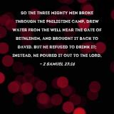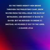 So the three mighty men broke through the Philistine camp, drew water from the well near the gate of Bethlehem, and brought it back to David. But he refused to drink it; instead, he poured it out to the LORD,