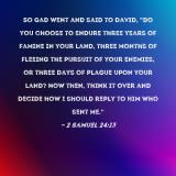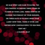 Pictures and Artwork So Gad went and said to David, "Do you choose to endure three years of famine in your land, three months of fleeing the pursuit of your enemies, or three days of plague upon your land? Now then, think it over and decide how I should reply to Him who sent me." |