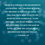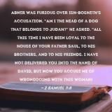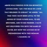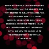 Pictures and Artwork Abner was furious over Ish-bosheth's accusation. "Am I the head of a dog that belongs to Judah?" he asked. "All this time I have been loyal to the house of your father Saul, to his brothers, and to his friends. I have not delivered you into the hand of David, but now you accuse me of wrongdoing with this woman! |