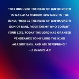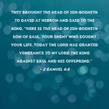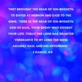 Pictures and Artwork They brought the head of Ish-bosheth to David at Hebron and said to the king, "Here is the head of Ish-bosheth son of Saul, your enemy who sought your life. Today the LORD has granted vengeance to my lord the king against Saul and his offspring." |