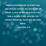 Then he distributed to every man and woman among the multitude of Israel a loaf of bread, a date cake, and a raisin cake. And all the people departed, each for his own home.