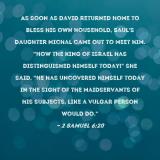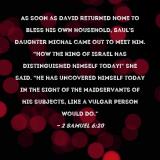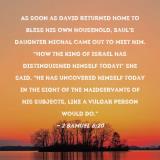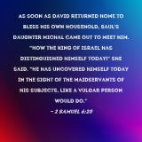 Pictures and Artwork As soon as David returned home to bless his own household, Saul's daughter Michal came out to meet him. "How the king of Israel has distinguished himself today!" she said. "He has uncovered himself today in the sight of the maidservants of his subjects, like a vulgar person would do." |