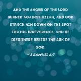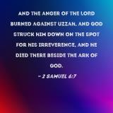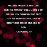 And the anger of the LORD burned against Uzzah, and God struck him down on the spot for his irreverence, and he died there beside the ark of God.