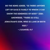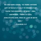 So the king asked, "Is there anyone left of Saul's family to whom I can show the kindness of God?" Ziba answered, "There is still Jonathan's son, who is lame in both feet."