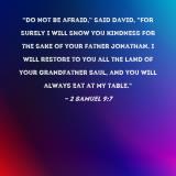 "Do not be afraid," said David, "for surely I will show you kindness for the sake of your father Jonathan. I will restore to you all the land of your grandfather Saul, and you will always eat at my table."