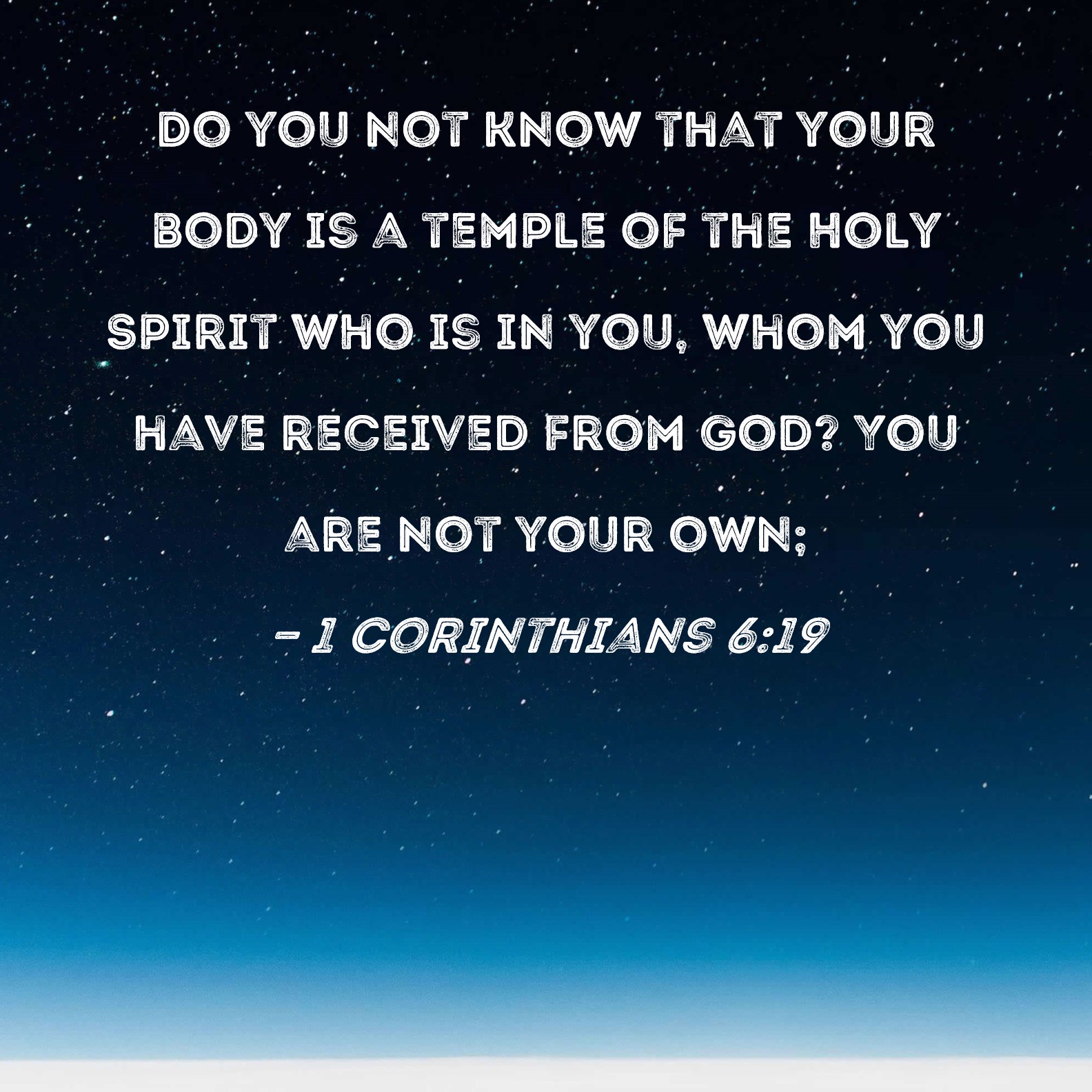 1 Corinthians 6:19 NIV1 Corinthians 6:19 NLT1 Corinthians 6:19 ESV1 Corinthians 6:19 NASB1 Corinthians 6:19 KJV1 Corinthians 6:19 Interlinear1 Corinthians 6:19 Commentaries1 Corinthians 6:19 Parallel Texts1 Corinthians 6:19 Bible Apps1 Corinthians 6:19 ParallelBible Hub