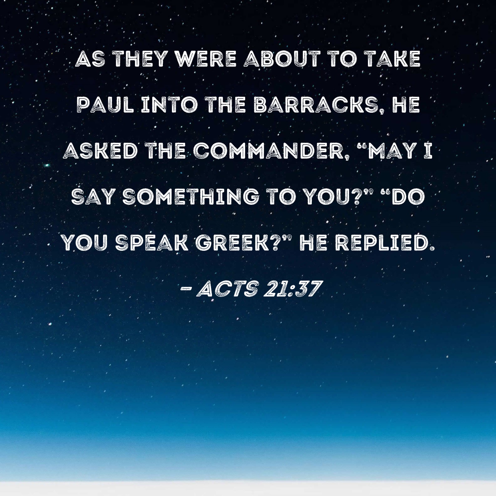Acts 21:37 As they were about to take Paul into the barracks, he asked the commander, "May I say something to you?" "Do you speak Greek?" he replied.