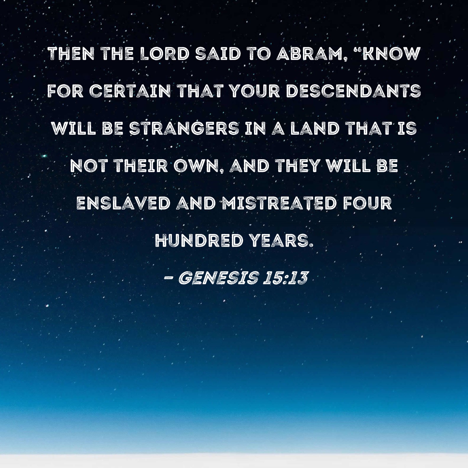 Genesis 15:13 Then the LORD said to Abram, "Know for certain that your descendants will be strangers in a land that is not their own, and they will be enslaved and mistreated four hundred years.