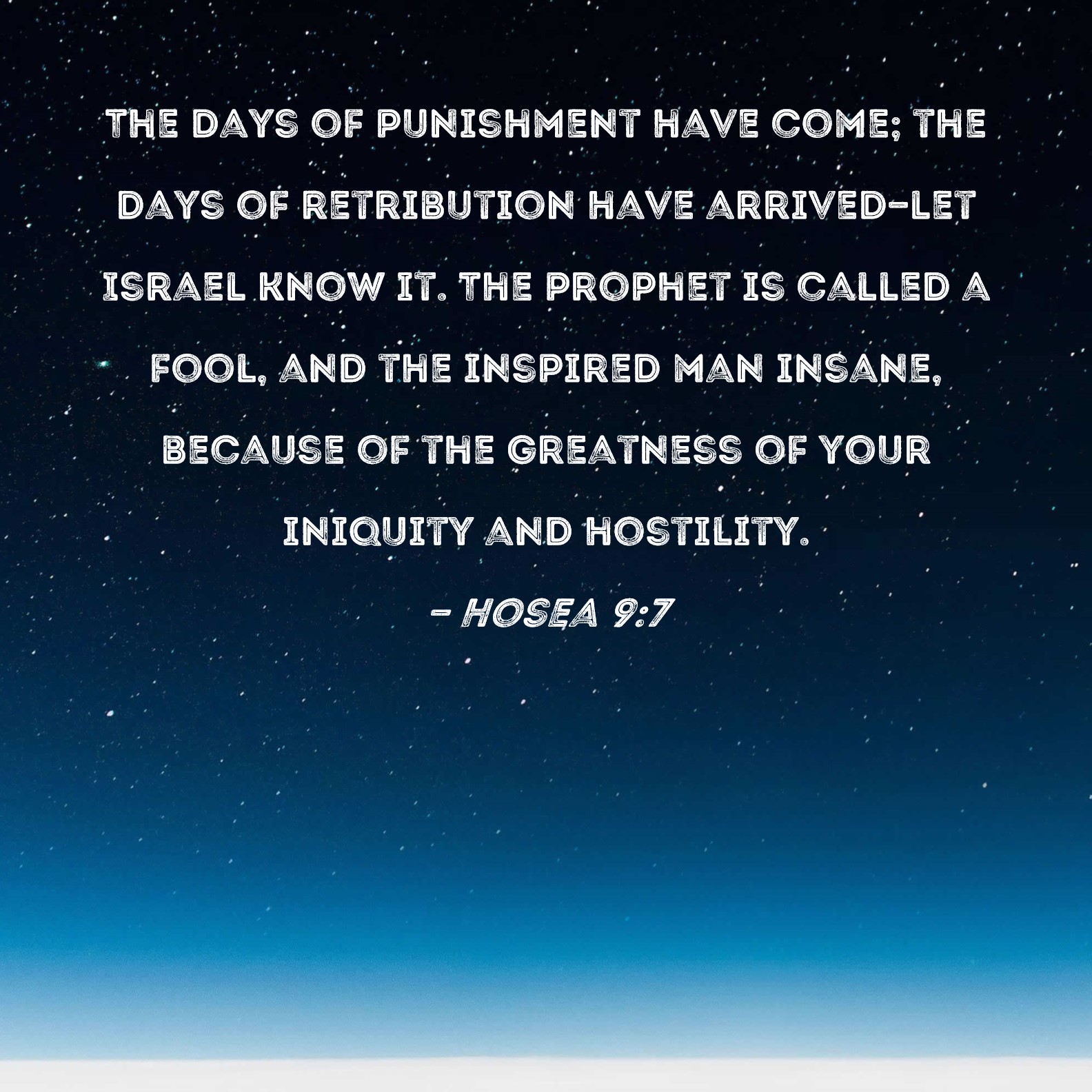 Hosea 9:7 The days of punishment have come; the days of retribution have arrived--let Israel know it. The prophet is called a fool, and the inspired man insane, because of the greatness of your iniquity and hostility.