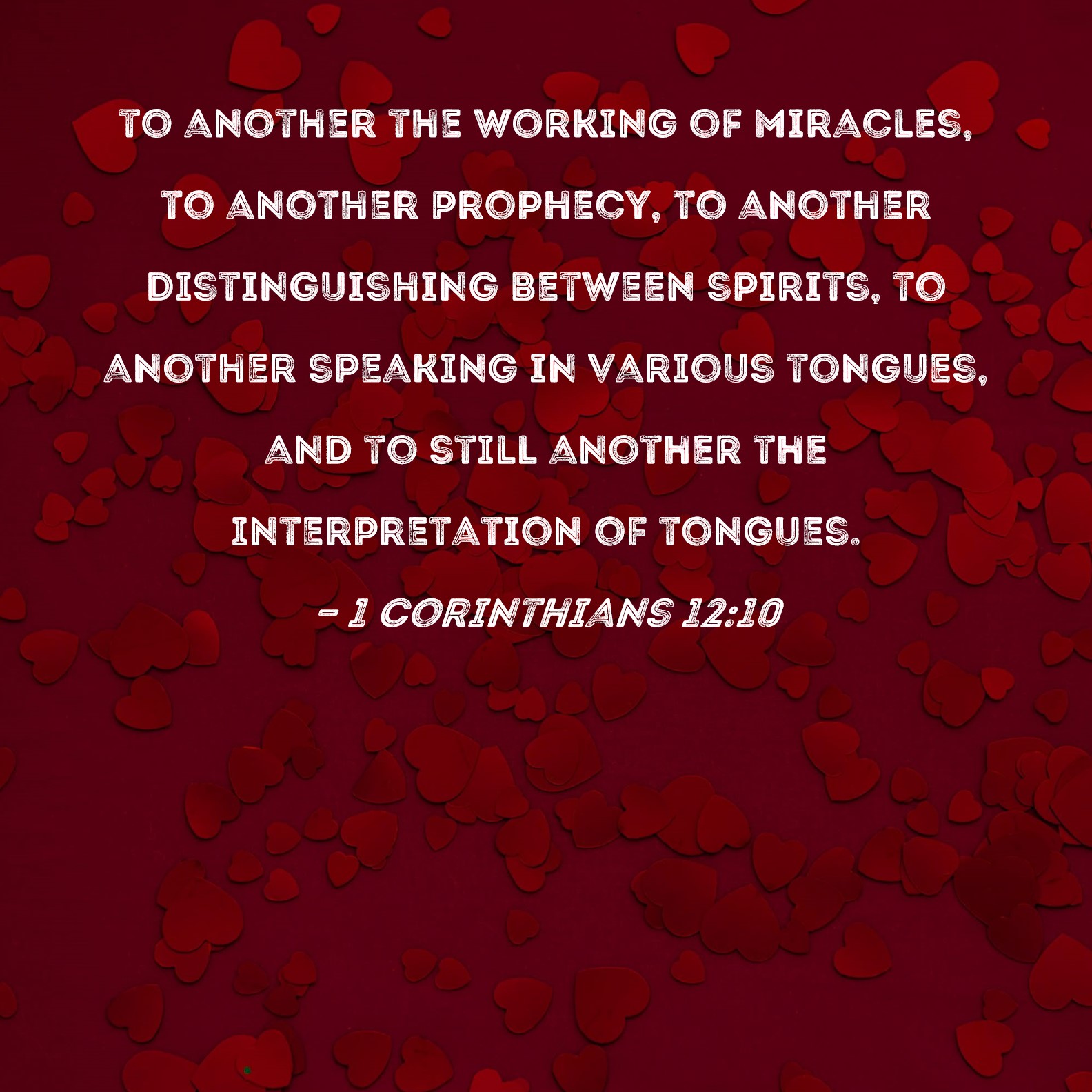 1 Corinthians 12:10 to another the working of miracles, to another prophecy, to another distinguishing between spirits, to another speaking in various tongues, and to still another the interpretation of tongues.