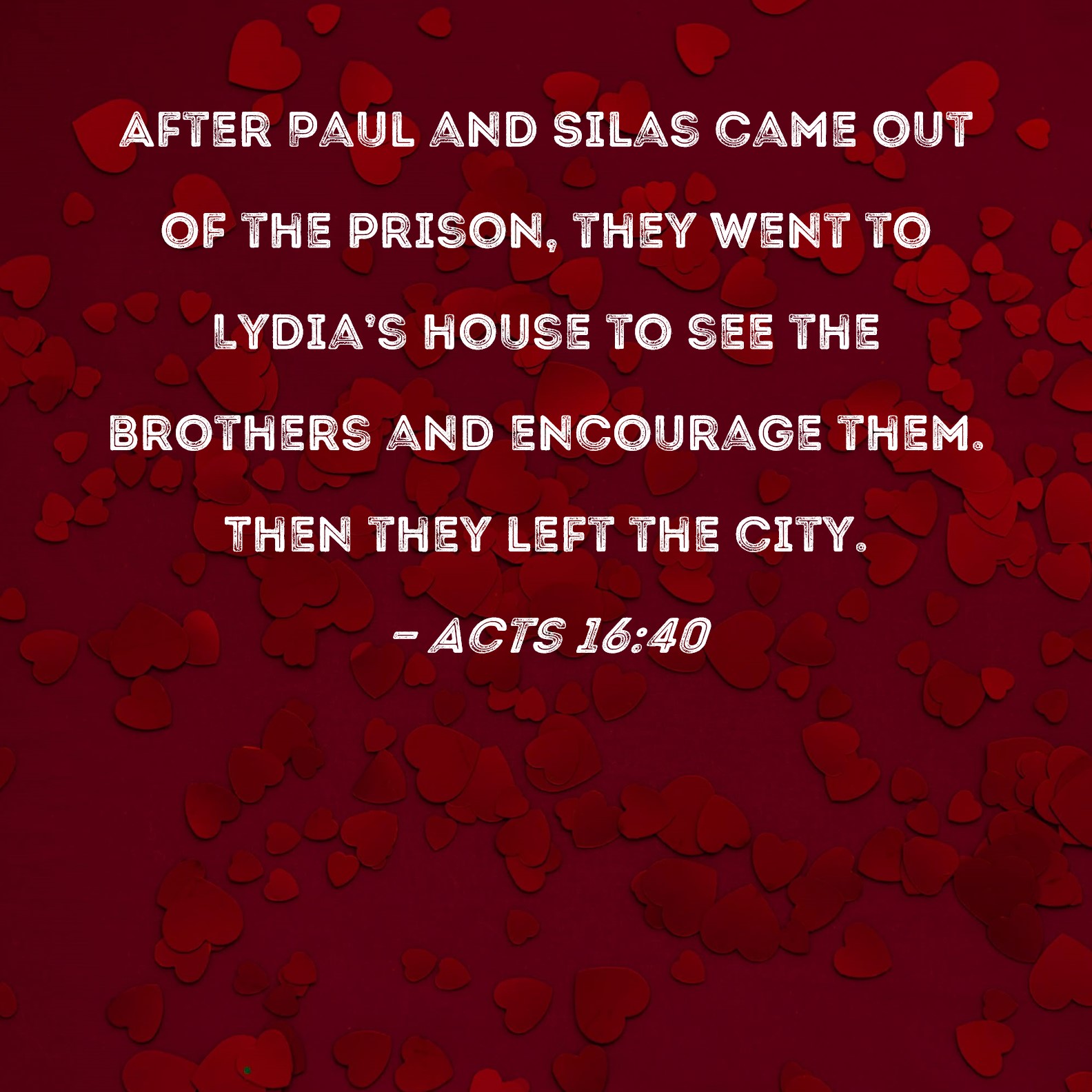 Acts 16:40 After Paul and Silas came out of the prison, they went to Lydia's house to see the brothers and encourage them. Then they left the city.