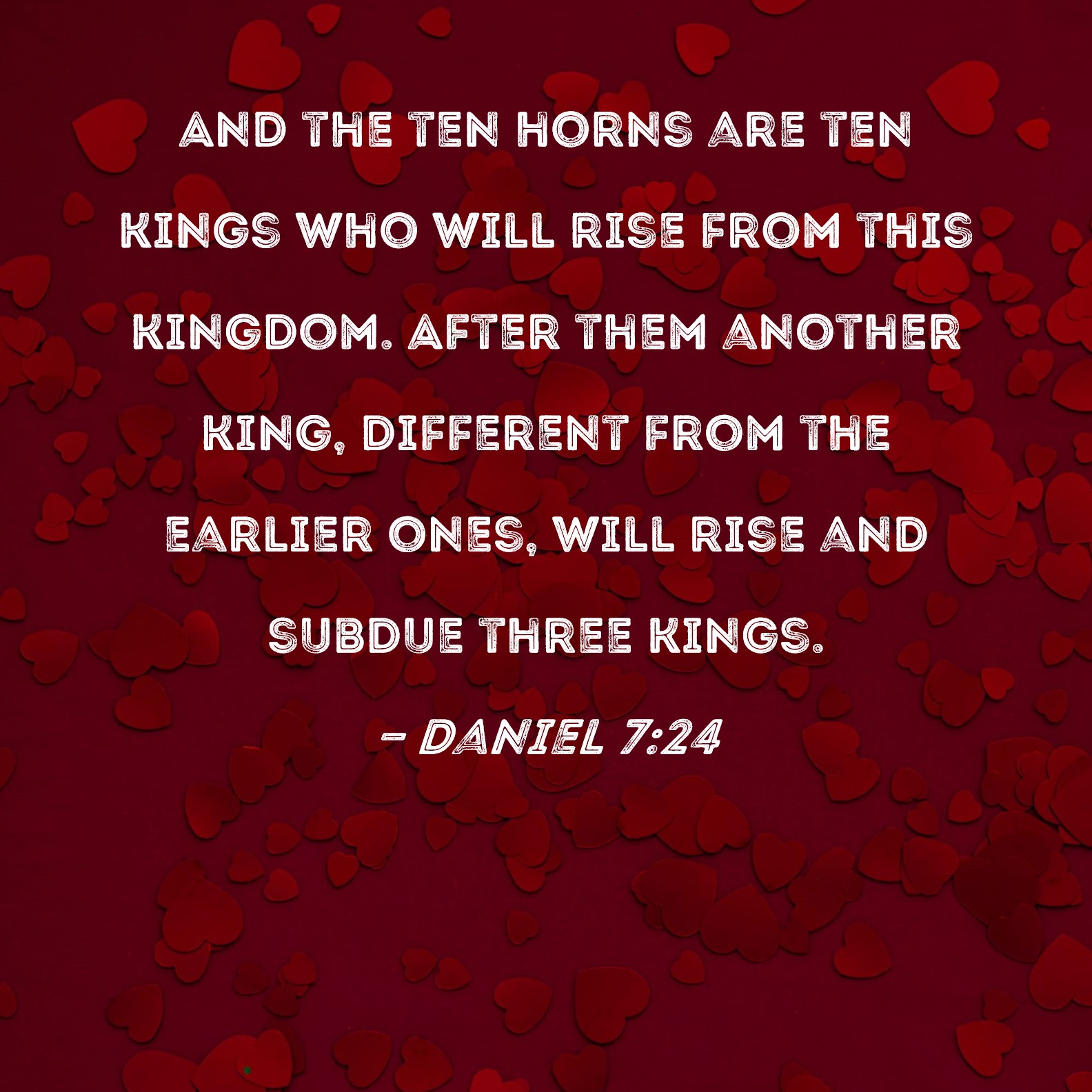 Daniel 7:24 And the ten horns are ten kings who will rise from this kingdom. After them another king, different from the earlier ones, will rise and subdue three kings.