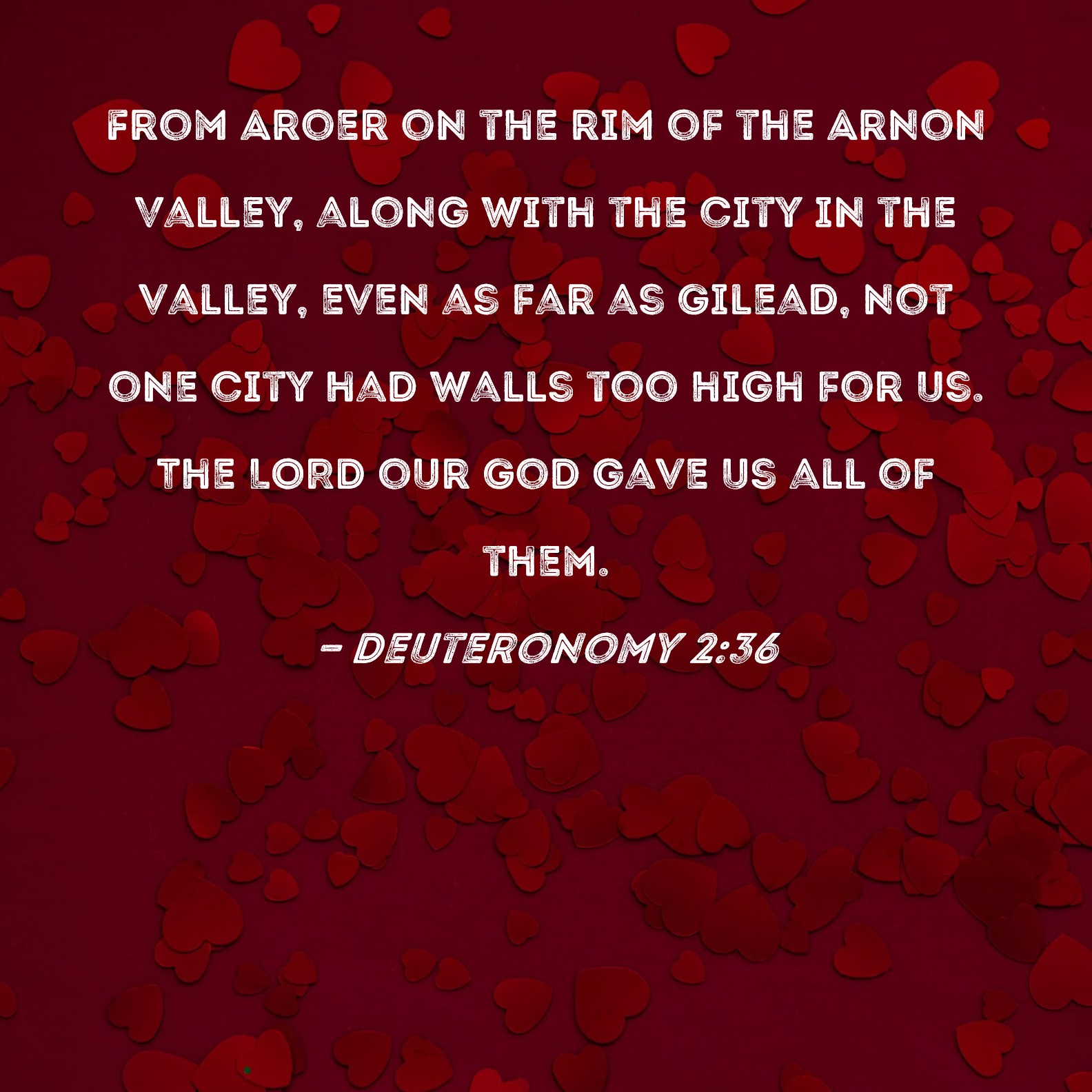 Deuteronomy 2:36 From Aroer on the rim of the Arnon Valley, along with the city in the valley, even as far as Gilead, not one city had walls too high for us. The LORD our God gave us all of them.