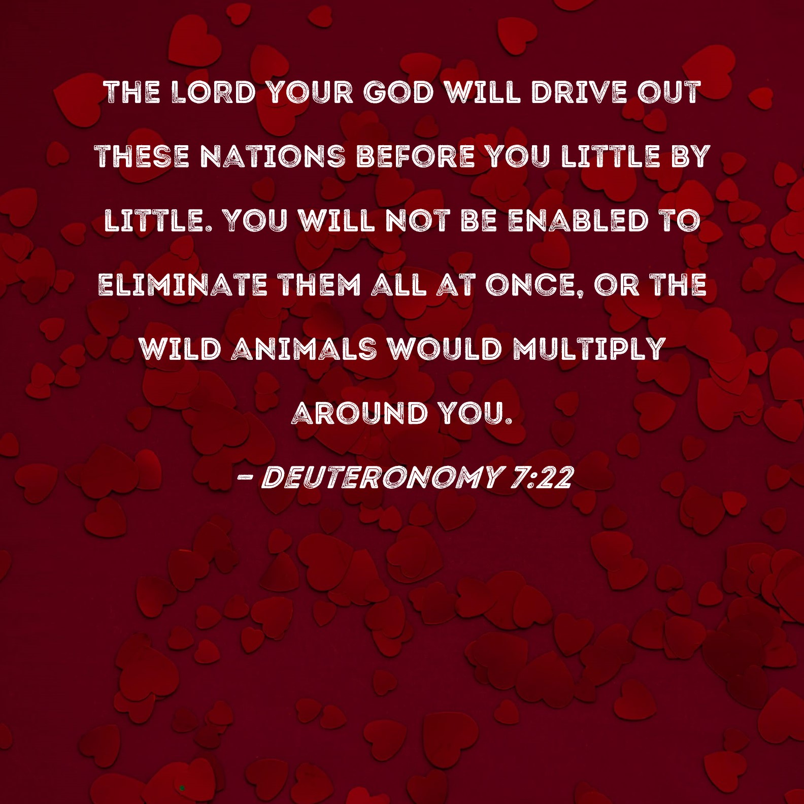 BSB: The LORD your God will drive out these nations before you little by little. You will not be enabled to eliminate them all at once, or the wild animals would multiply around you. KJV: And the LORD thy God will put out those nations before thee by little and little: thou mayest not consume them at once, lest the beasts of the field increase upon thee. DRB: He will consume these nations in thy sight by little and little and by degrees. Thou wilt not be able to destroy them altogether: lest perhaps the beasts of the earth should increase upon thee. DBT: And Jehovah thy God will cast out those nations from before thee by little and little; thou shalt not be able to make an end of them at once, lest the beasts of the field increase upon thee. ERV: And the LORD thy God will cast out those nations before thee by little and little: thou mayest not consume them at once, lest the beasts of the field increase upon thee. WBT: And the LORD thy God will drive out those nations before thee by little and little: thou mayest not consume them at once, lest the beasts of the field increase upon thee. WEB: Yahweh your God will cast out those nations before you little by little. You may not consume them at once, lest the animals of the field increase on you. YLT: And Jehovah thy God hath cast out these nations from thy presence little by little, (thou art not able to consume them hastily, lest the beast of the field multiply against thee),Links Deuteronomy 7:22 NIV • Deuteronomy 7:22 NLT • Deuteronomy 7:22 ESV • Deuteronomy 7:22 NASB • Deuteronomy 7:22 KJV • Deuteronomy 7:22 Interlinear • Deuteronomy 7:22 Commentaries • Deuteronomy 7:22 Parallel Texts • Deuteronomy 7:22 Bible Apps • Deuteronomy 7:22 Parallel • Bible Hub |