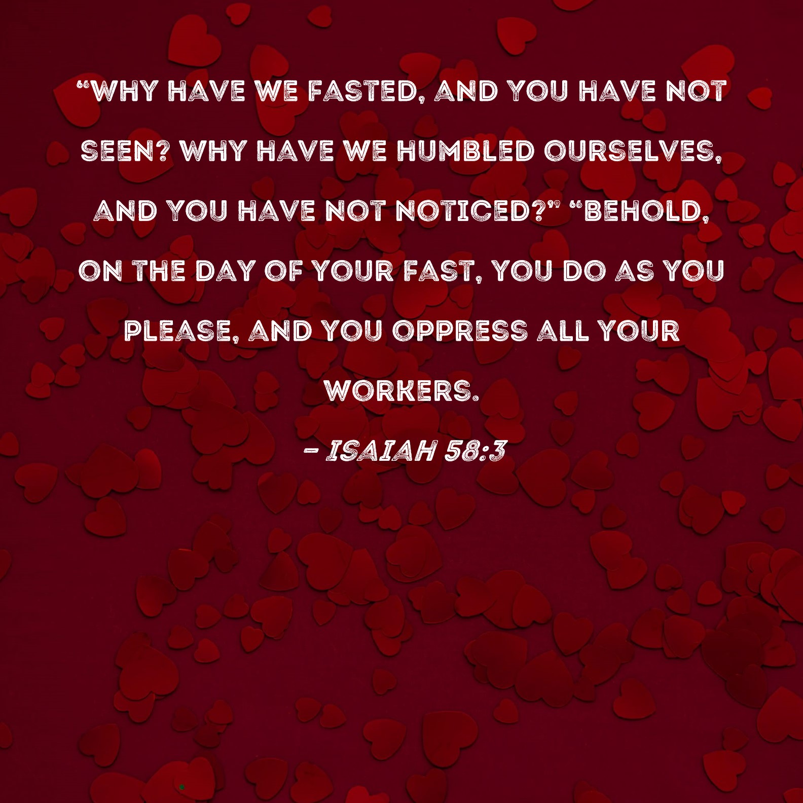 Isaiah 58:3 "Why have we fasted, and You have not seen? Why have we humbled ourselves, and You have not noticed?" "Behold, on the day of your fast, you do as you please, and you oppress all your workers.