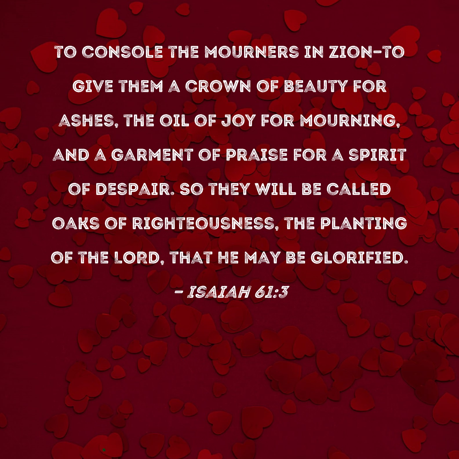 Isaiah 61:3 to console the mourners in Zion--to give them a crown of beauty for ashes, the oil of joy for mourning, and a garment of praise for a spirit of despair. So they will be called oaks of righteousness, the planting of the LORD, that He may be glorified.