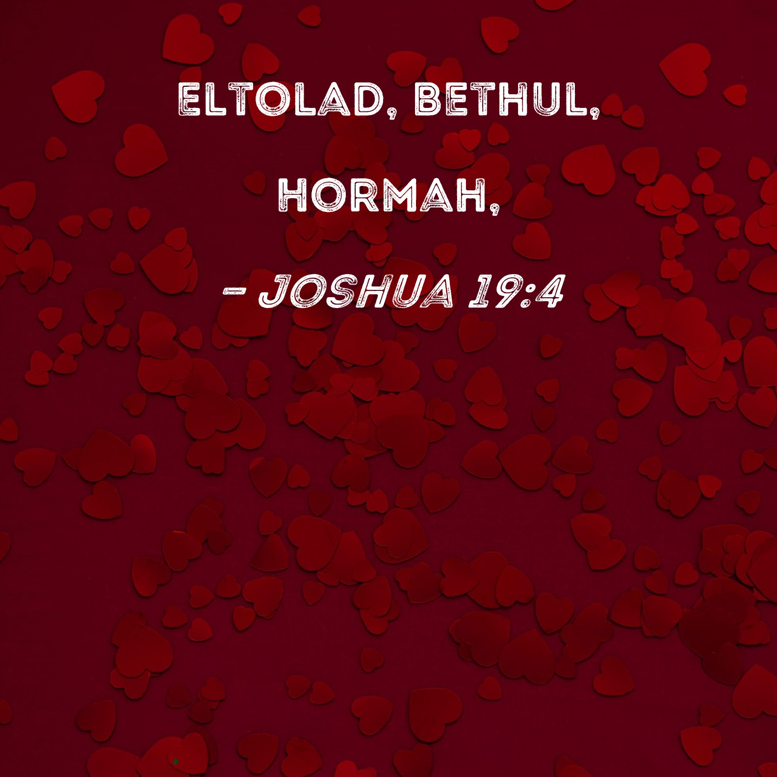 BSB: Eltolad, Bethul, Hormah, KJV: And Eltolad, and Bethul, and Hormah, DRB: And Eltholad, Bethul and Harma, DBT: and Eltolad, and Bethul, and Hormah, ERV: and Eltolad, and Bethul, and Hormah; WBT: And Eltolad, and Bethul, and Hormah, WEB: Eltolad, Bethul, Hormah, YLT: and Eltolad, and Bethul, and Hormah,Links Joshua 19:4 NIV • Joshua 19:4 NLT • Joshua 19:4 ESV • Joshua 19:4 NASB • Joshua 19:4 KJV • Joshua 19:4 Interlinear • Joshua 19:4 Commentaries • Joshua 19:4 Parallel Texts • Joshua 19:4 Bible Apps • Joshua 19:4 Parallel • Bible Hub |