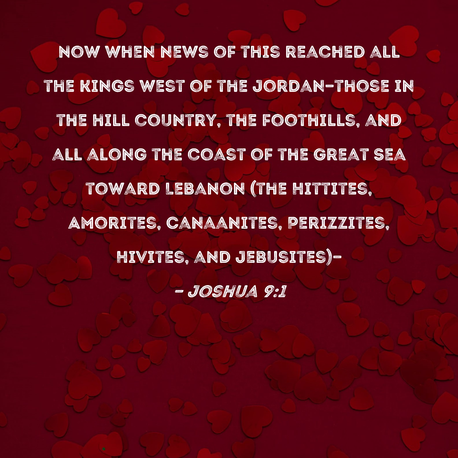 Joshua 9:1 Now when news of this reached all the kings west of the Jordan--those in the hill country, the foothills, and all along the coast of the Great Sea toward Lebanon (the Hittites, Amorites, Canaanites, Perizzites, Hivites, and Jebusites)--
