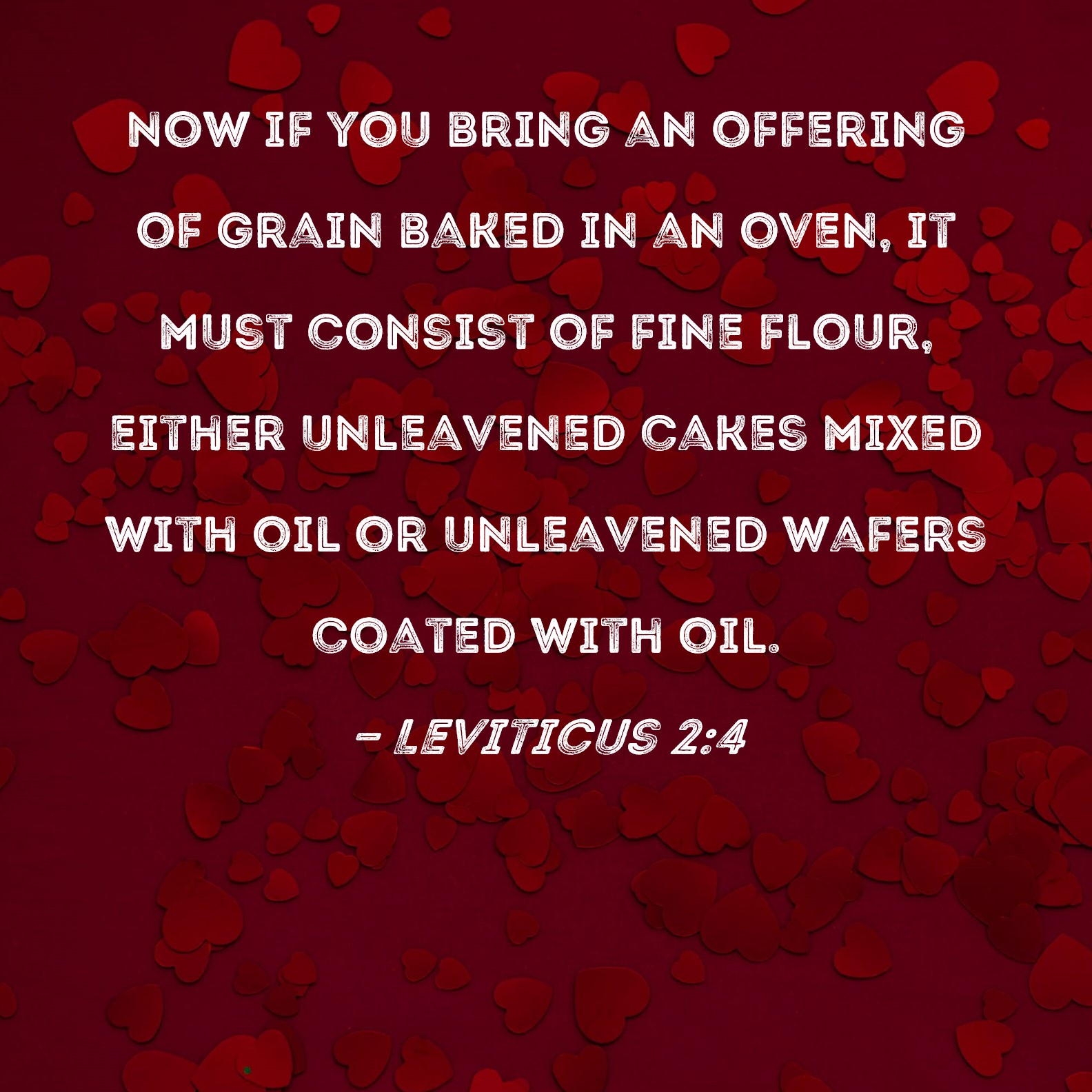 Leviticus 2:4 Now if you bring an offering of grain baked in an oven, it must consist of fine flour, either unleavened cakes mixed with oil or unleavened wafers coated with oil.