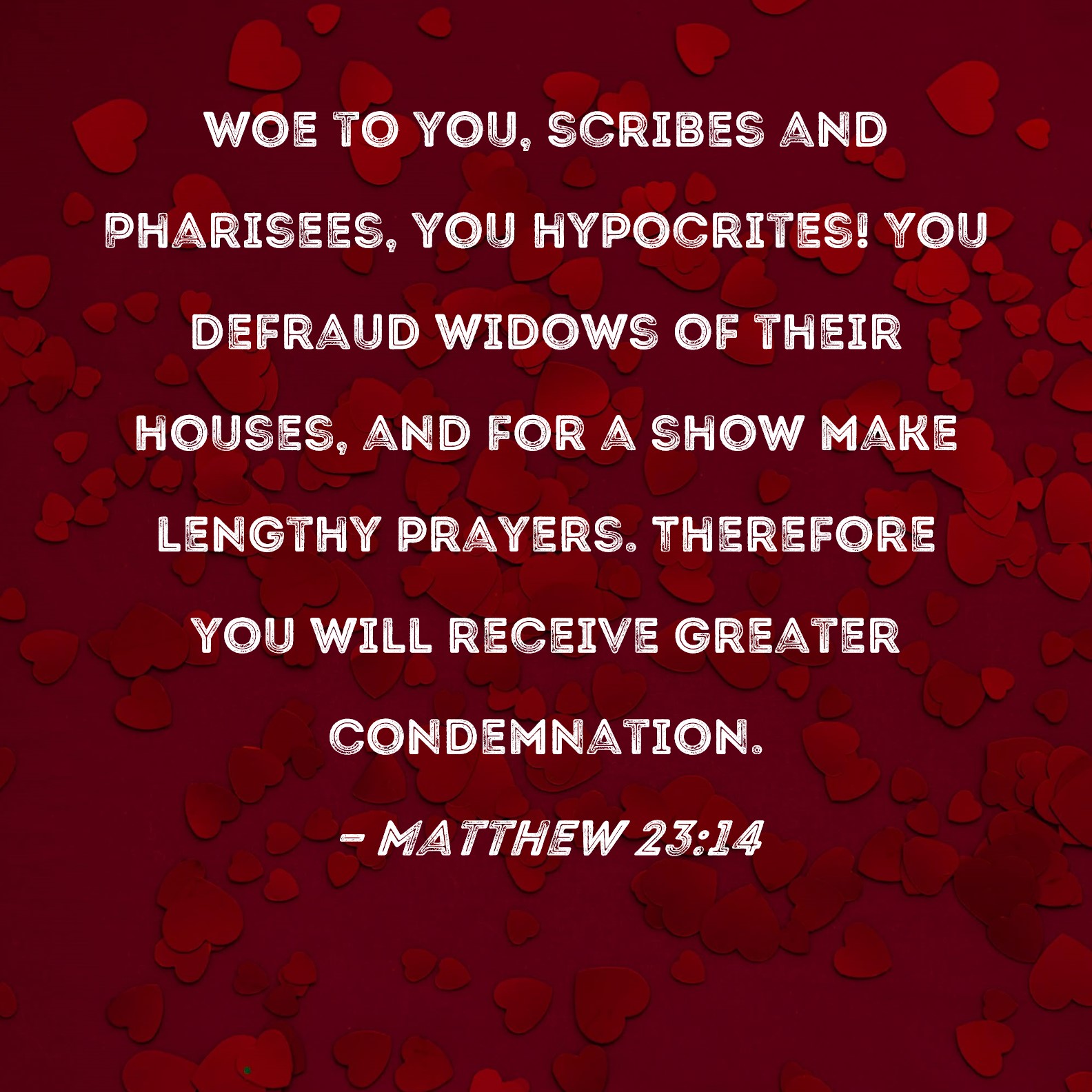 Matthew 23:14 Woe to you, scribes and Pharisees, you hypocrites! You defraud widows of their houses, and for a show make lengthy prayers. Therefore you will receive greater condemnation.