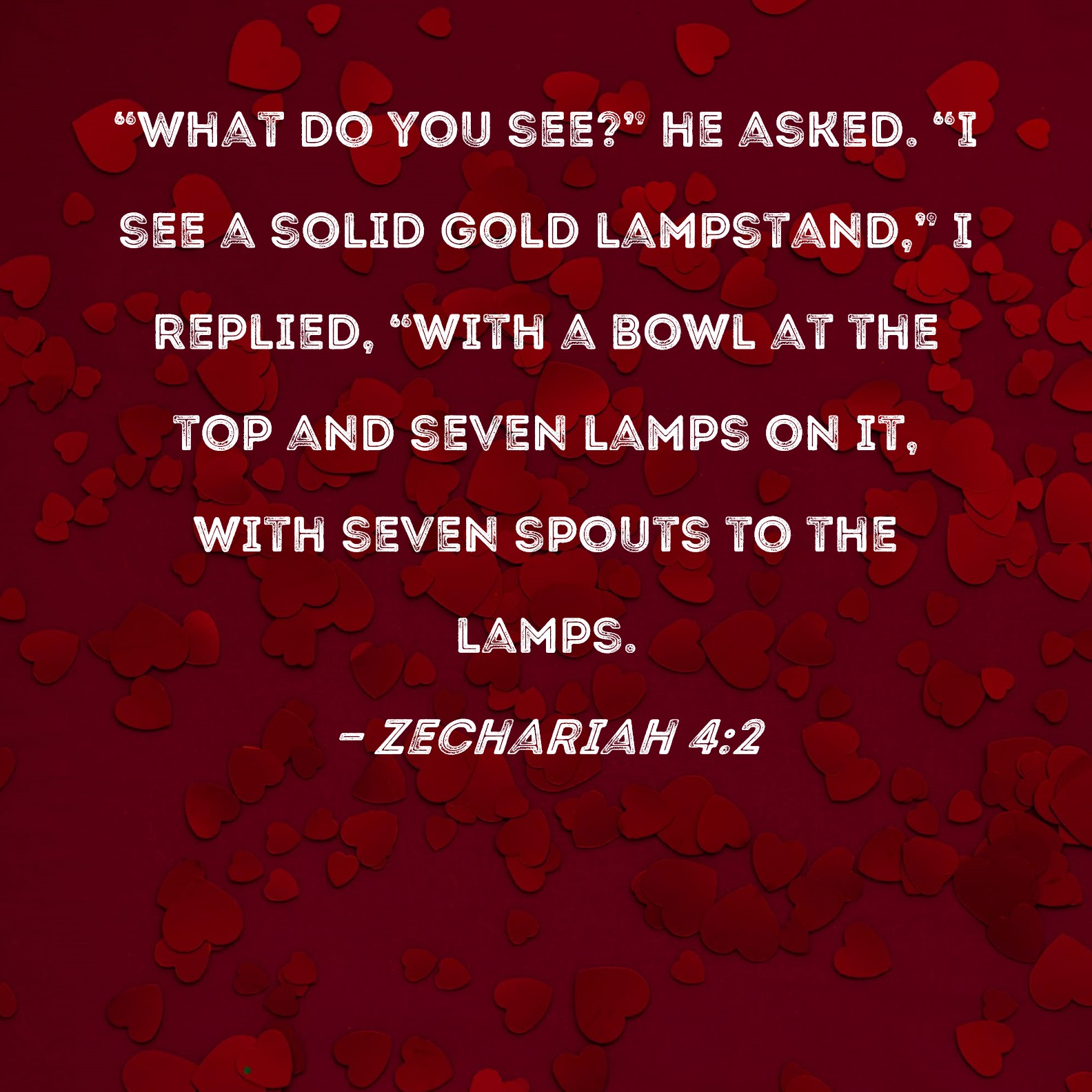 WEB:  He said to me, “What do you see?” I said, “I have seen, and behold, a lamp stand all of gold, with its bowl on the top of it, and its seven lamps on it; there are seven pipes to each of the lamps which are on the top of it;