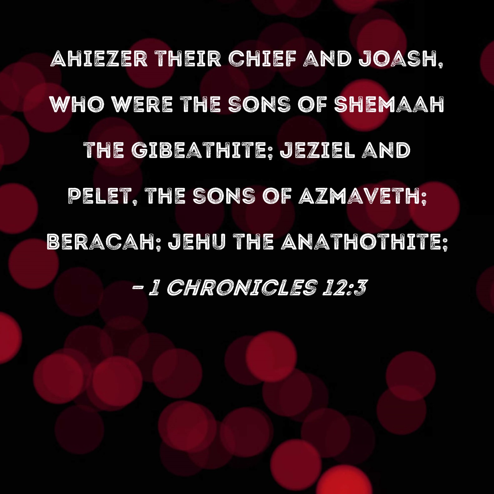 1 Chronicles 12:3 Ahiezer their chief and Joash, who were the sons of Shemaah the Gibeathite; Jeziel and Pelet, the sons of Azmaveth; Beracah; Jehu the Anathothite;