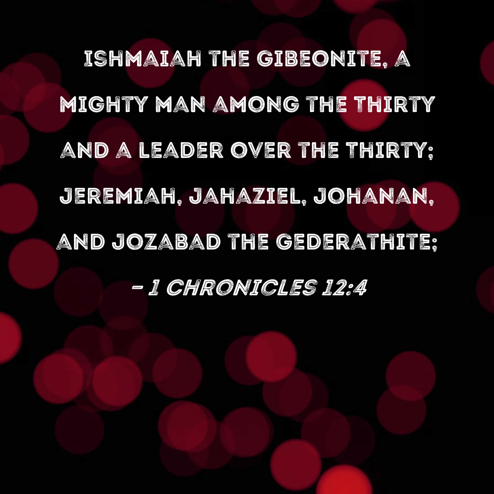 1 Chronicles 12:4 Ishmaiah the Gibeonite, a mighty man among the Thirty and a leader over the Thirty; Jeremiah, Jahaziel, Johanan, and Jozabad the Gederathite;