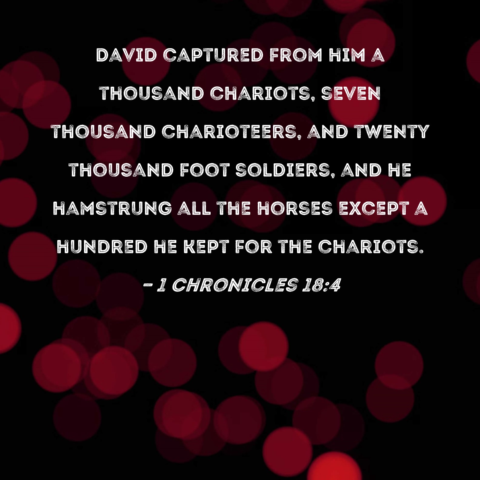 1 Chronicles 18:4 David captured from him a thousand chariots, seven thousand charioteers, and twenty thousand foot soldiers, and he hamstrung all the horses except a hundred he kept for the chariots.