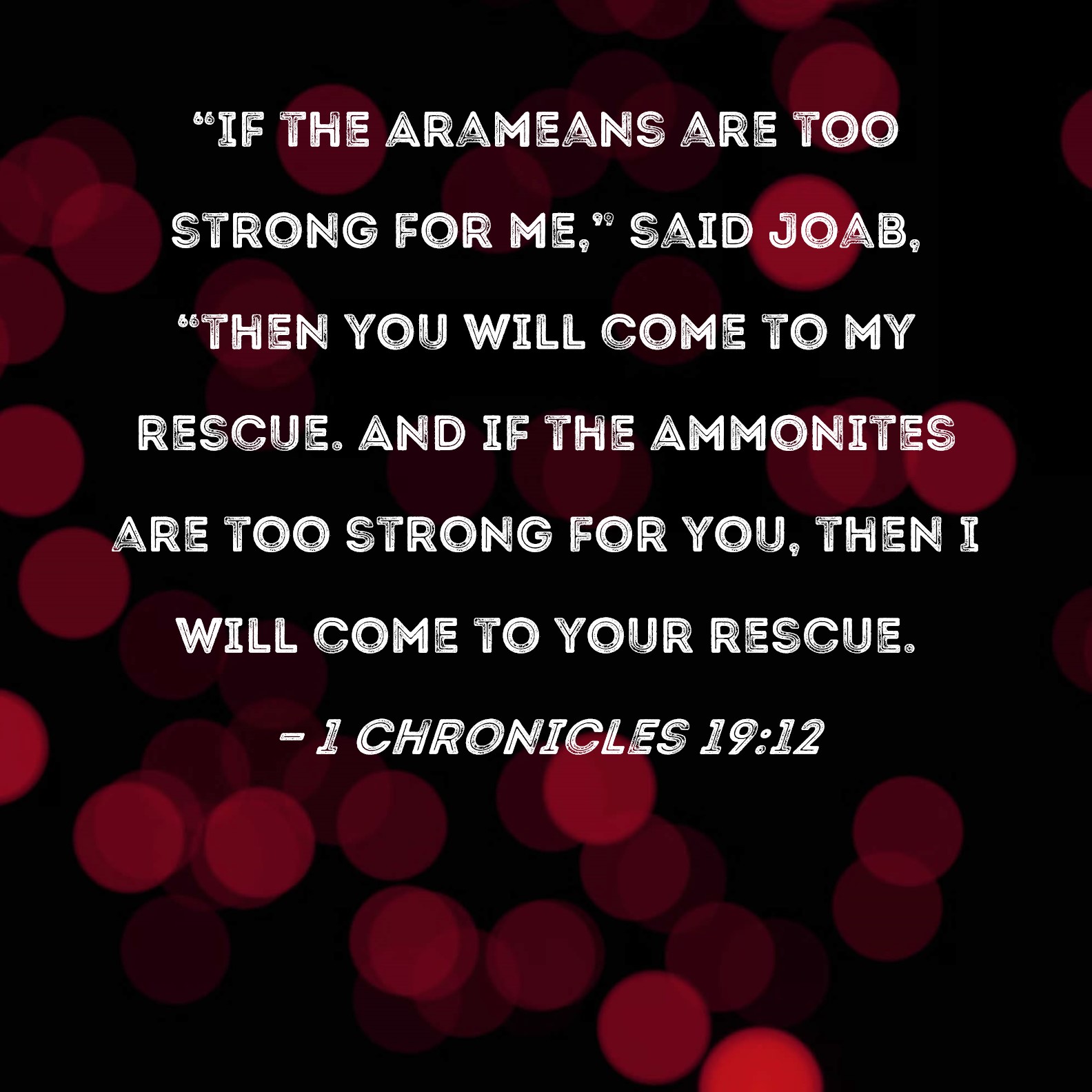1 Chronicles 19:12 "If the Arameans are too strong for me," said Joab, "then you will come to my rescue. And if the Ammonites are too strong for you, then I will come to your rescue.