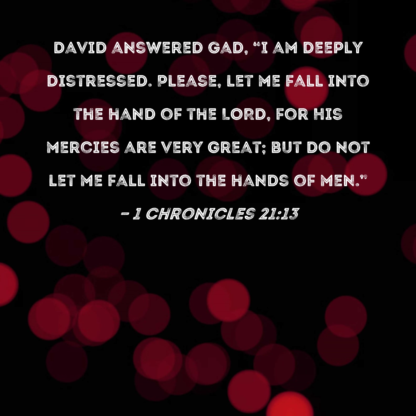 1 Chronicles 21:13 David answered Gad, "I am deeply distressed. Please, let me fall into the hand of the LORD, for His mercies are very great; but do not let me fall into the hands of men."