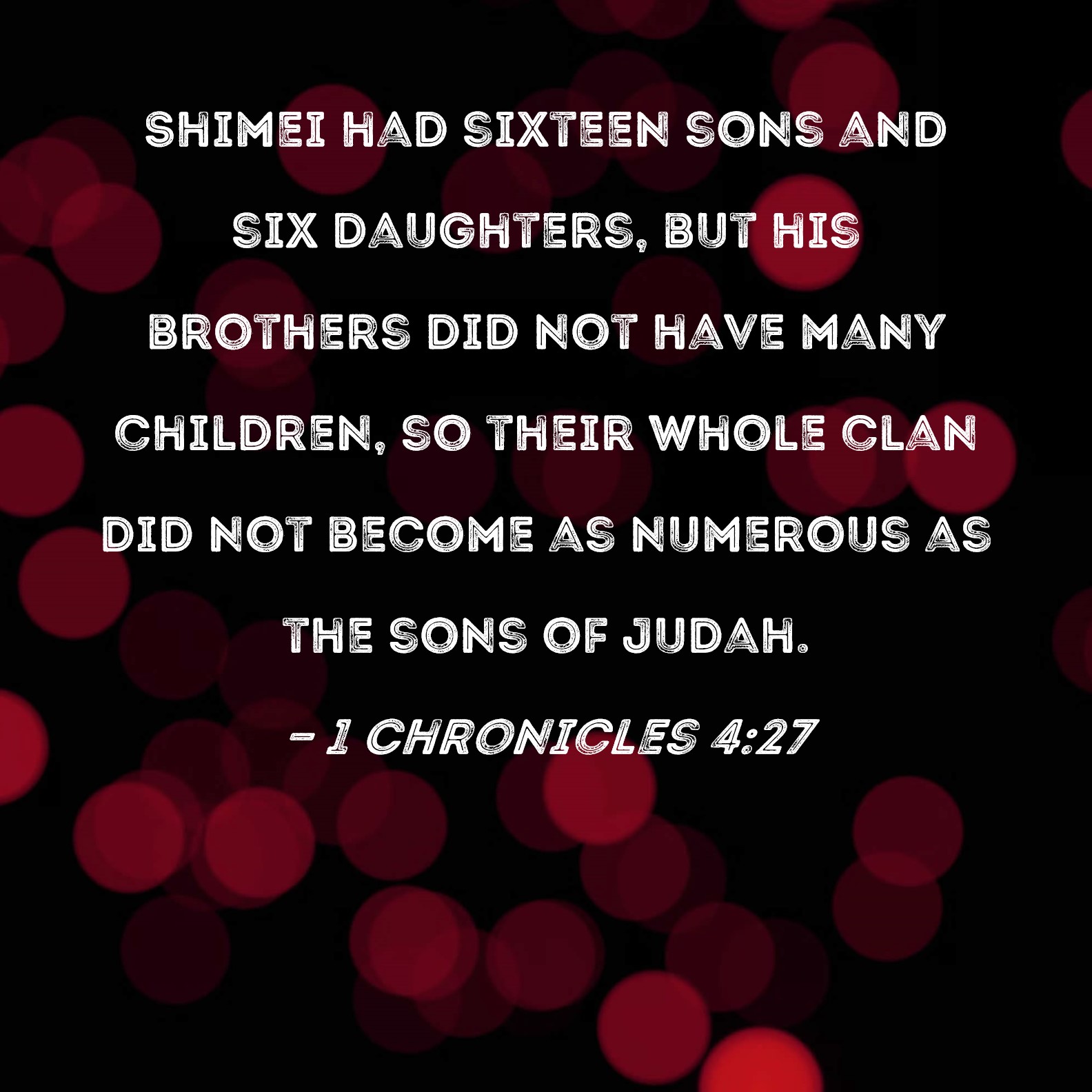 1 Chronicles 4:27 Shimei had sixteen sons and six daughters, but his brothers did not have many children, so their whole clan did not become as numerous as the sons of Judah.