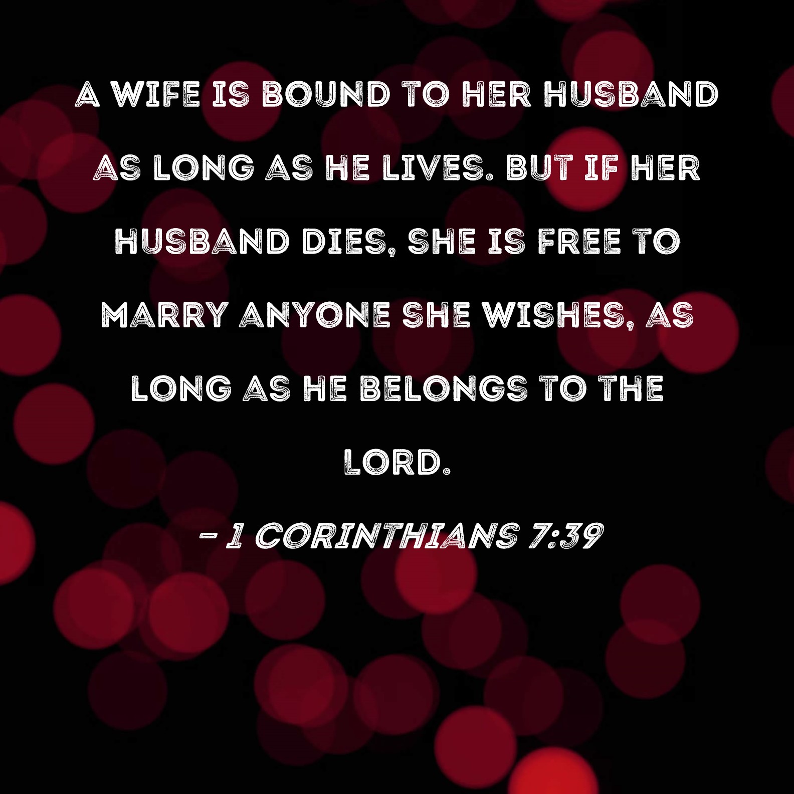 1 Corinthians 7:39 A wife is bound to her husband as long as he lives. But if her husband dies, she is free to marry anyone she wishes, as long as he belongs to the Lord.