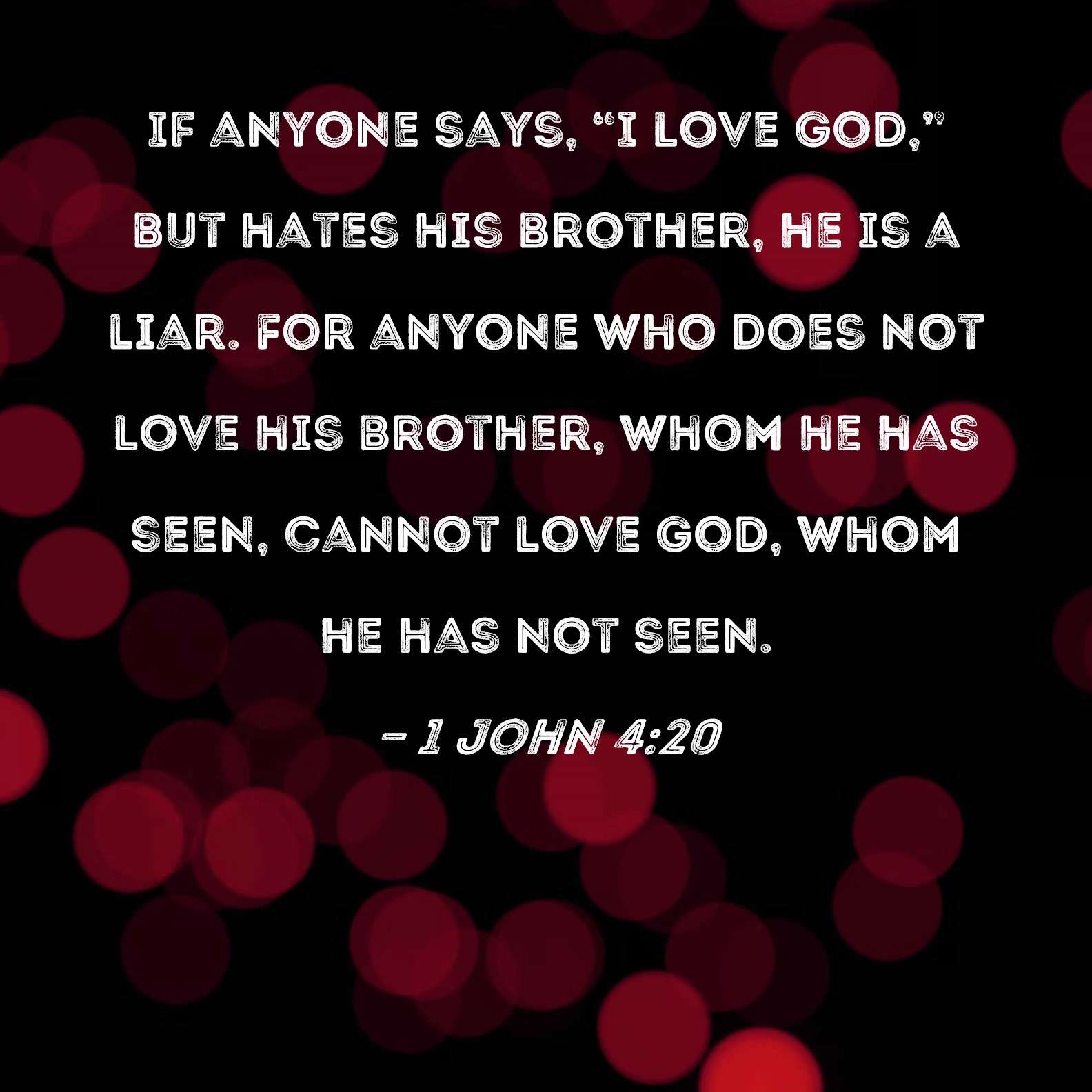1 John 4:20 If anyone says, "I love God," but hates his brother, he is a liar. For anyone who does not love his brother, whom he has seen, cannot love God, whom he has not seen.