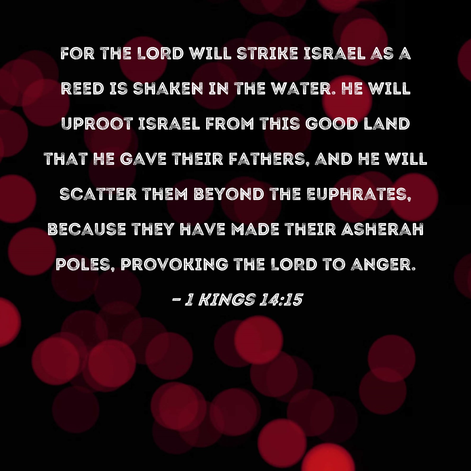 1 Kings 14:15 For the LORD will strike Israel as a reed is shaken in the water. He will uproot Israel from this good land that He gave their fathers, and He will scatter them beyond the Euphrates, because they have made their Asherah poles, provoking the LORD to anger.