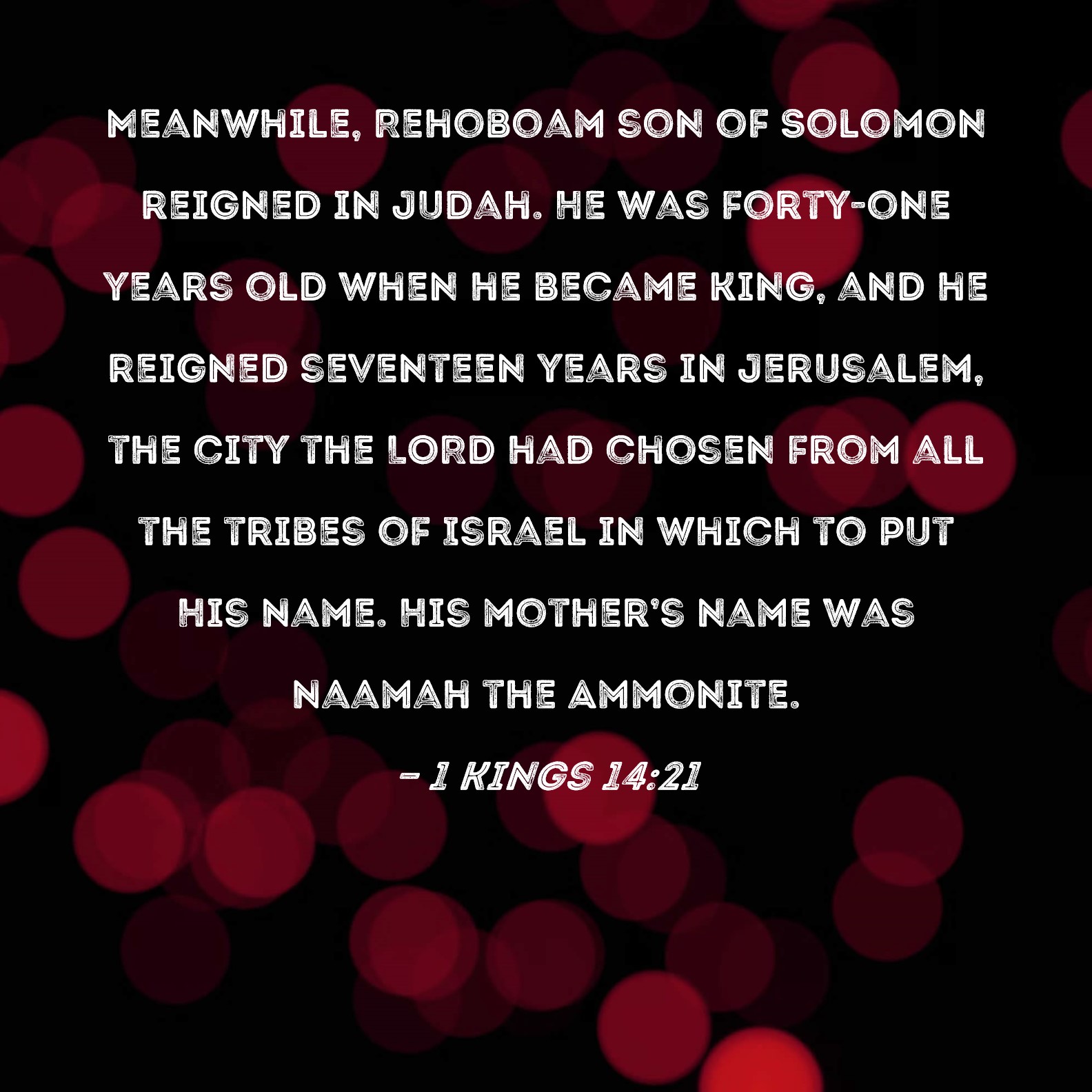 1 Kings 14:21 Meanwhile, Rehoboam son of Solomon reigned in Judah. He was forty-one years old when he became king, and he reigned seventeen years in Jerusalem, the city the LORD had chosen from all the tribes of Israel in which to put His Name. His mother's name was Naamah the Ammonite.