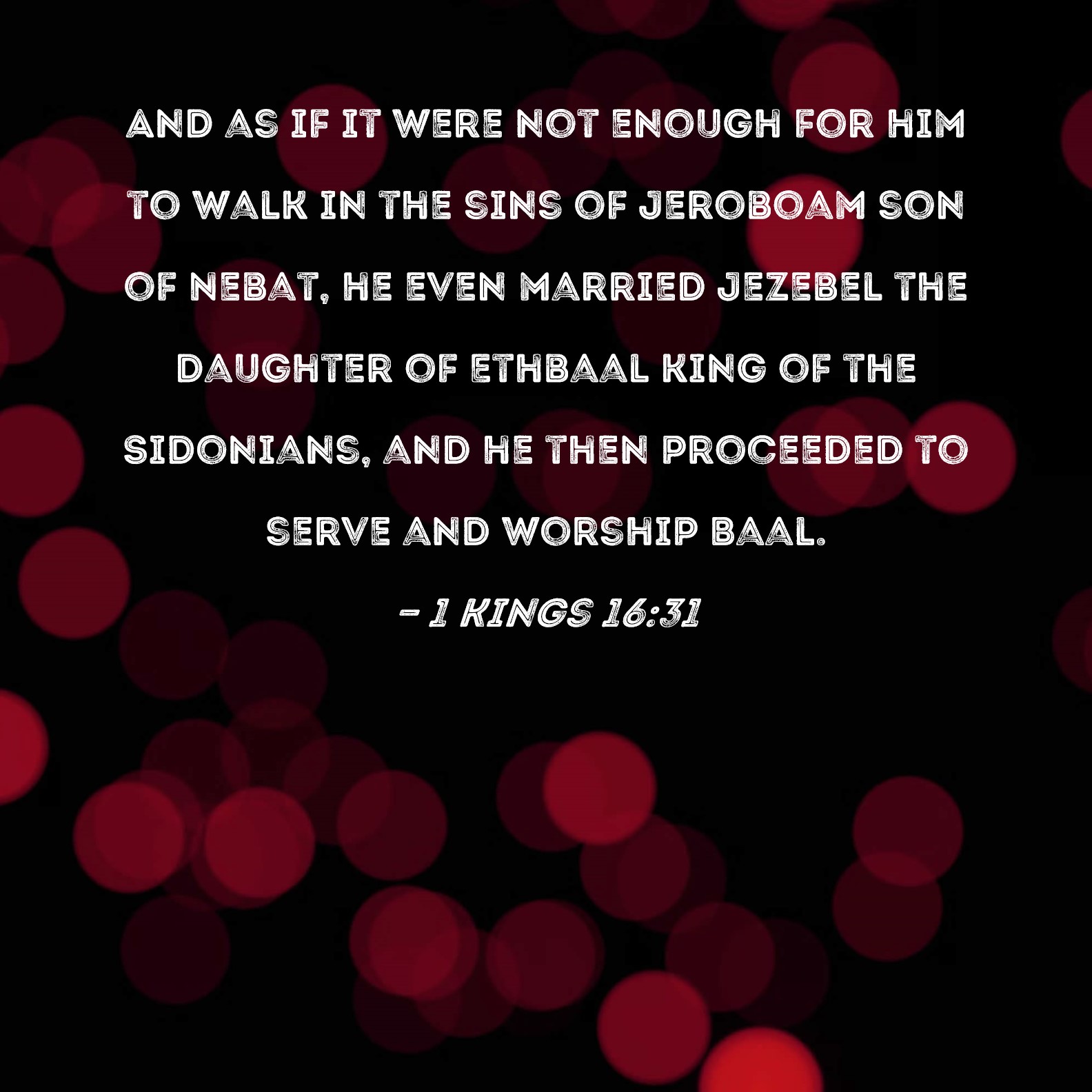 1 Kings 16:31 And as if it were not enough for him to walk in the sins of Jeroboam son of Nebat, he even married Jezebel the daughter of Ethbaal king of the Sidonians, and he then proceeded to serve and worship Baal.