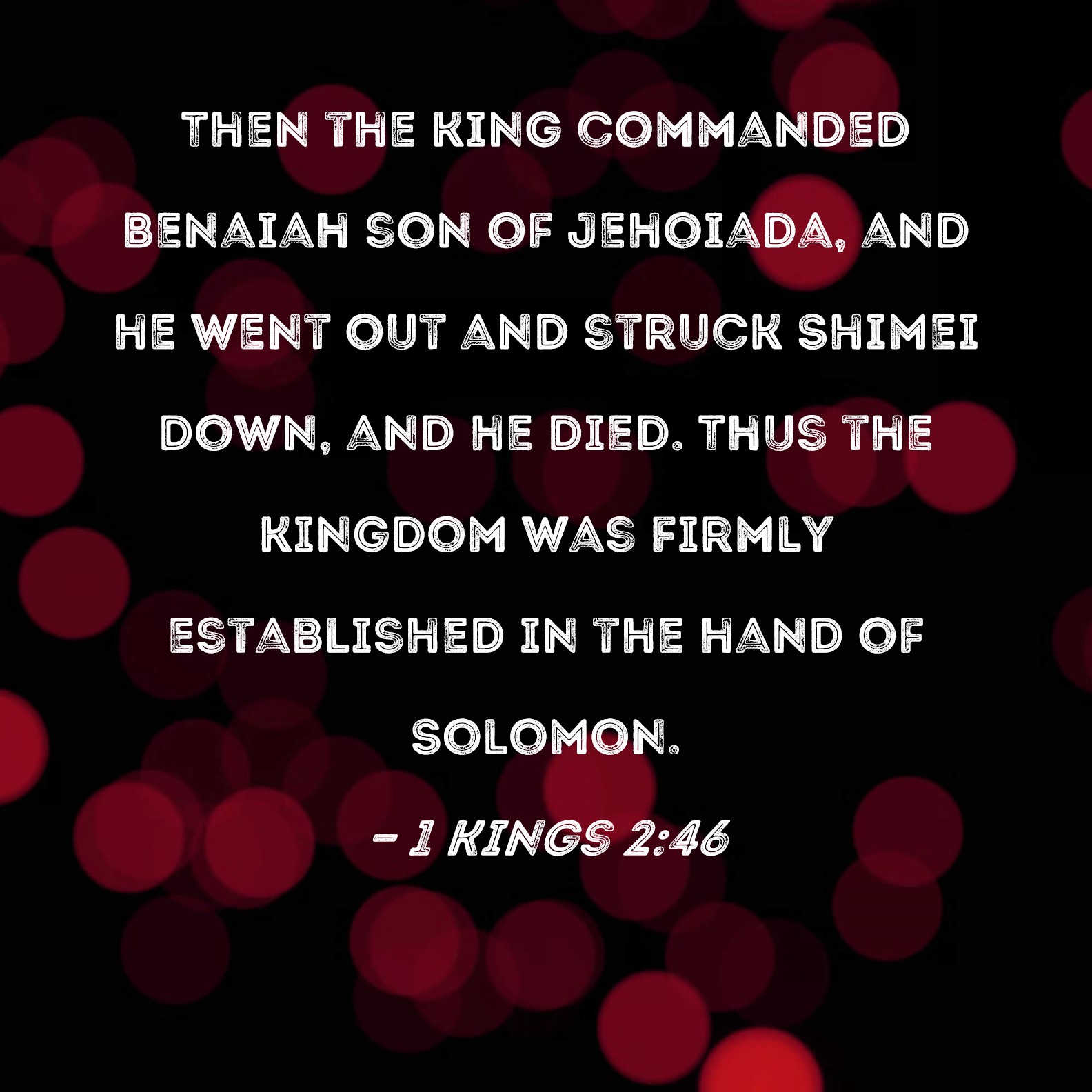 1 Kings 2:46 Then the king commanded Benaiah son of Jehoiada, and he went out and struck Shimei down, and he died. Thus the kingdom was firmly established in the hand of Solomon.