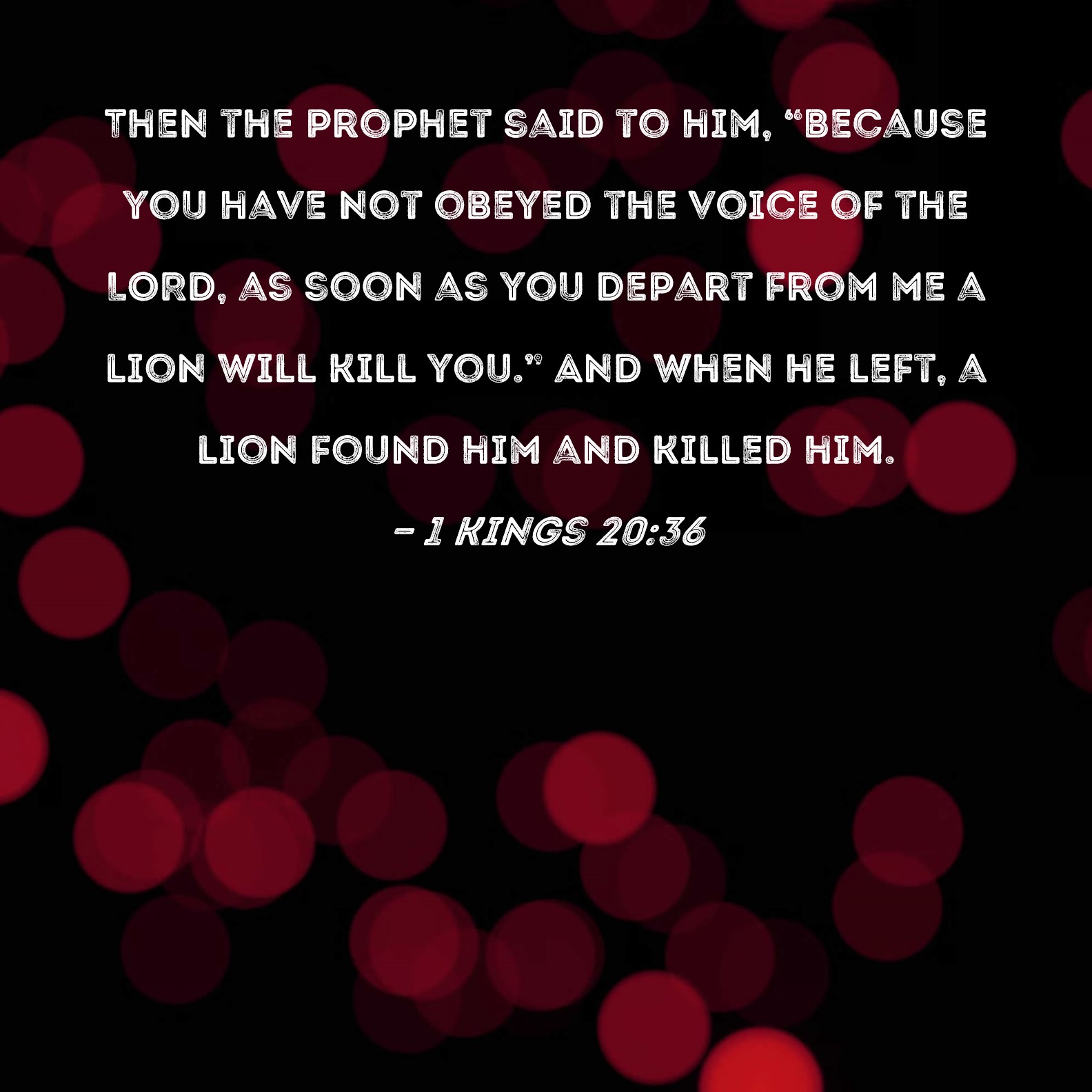 1 Kings 20:36 Then the prophet said to him, "Because you have not obeyed the voice of the LORD, as soon as you depart from me a lion will kill you." And when he left, a lion found him and killed him.