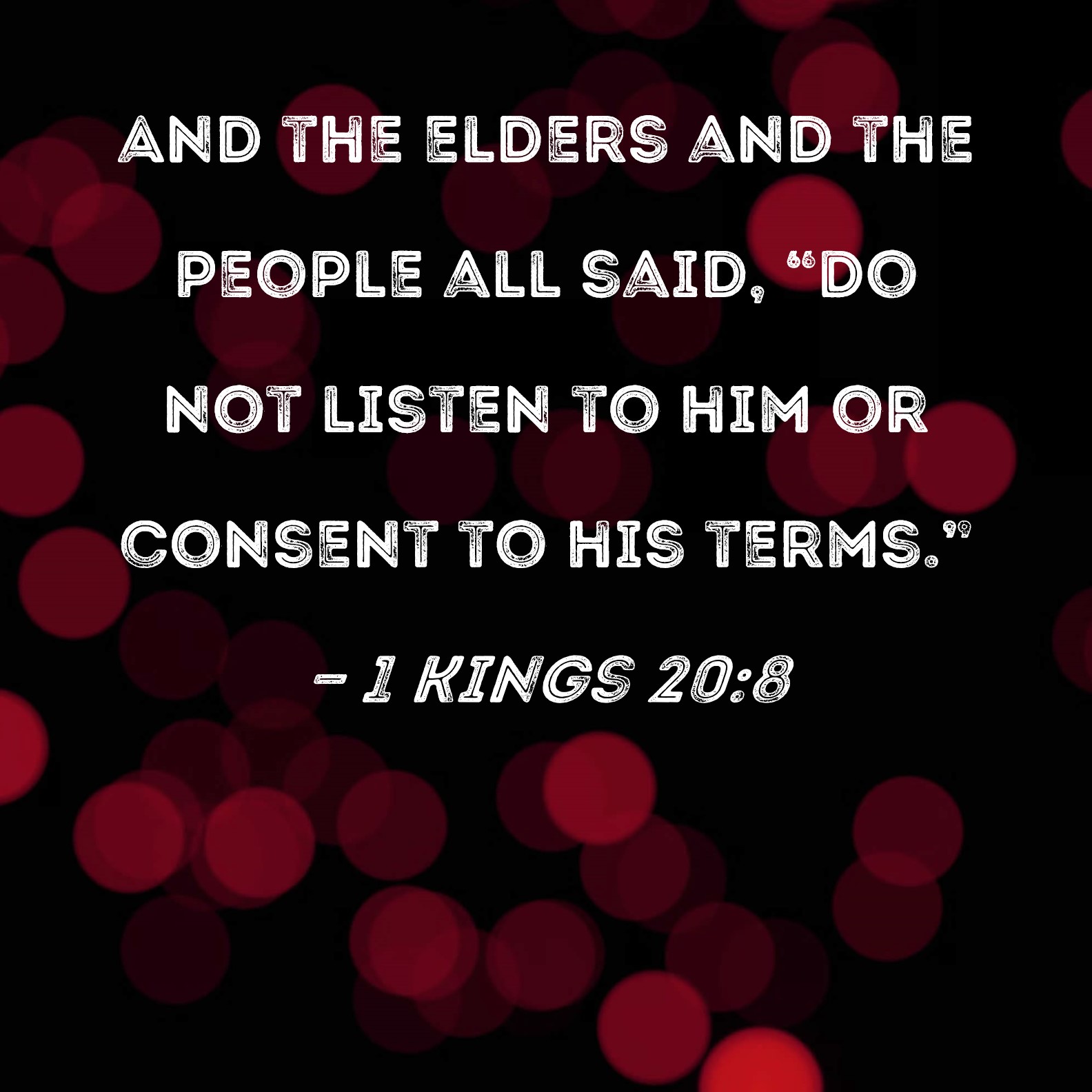 1 Kings 20:8 And the elders and the people all said, "Do not listen to him or consent to his terms."