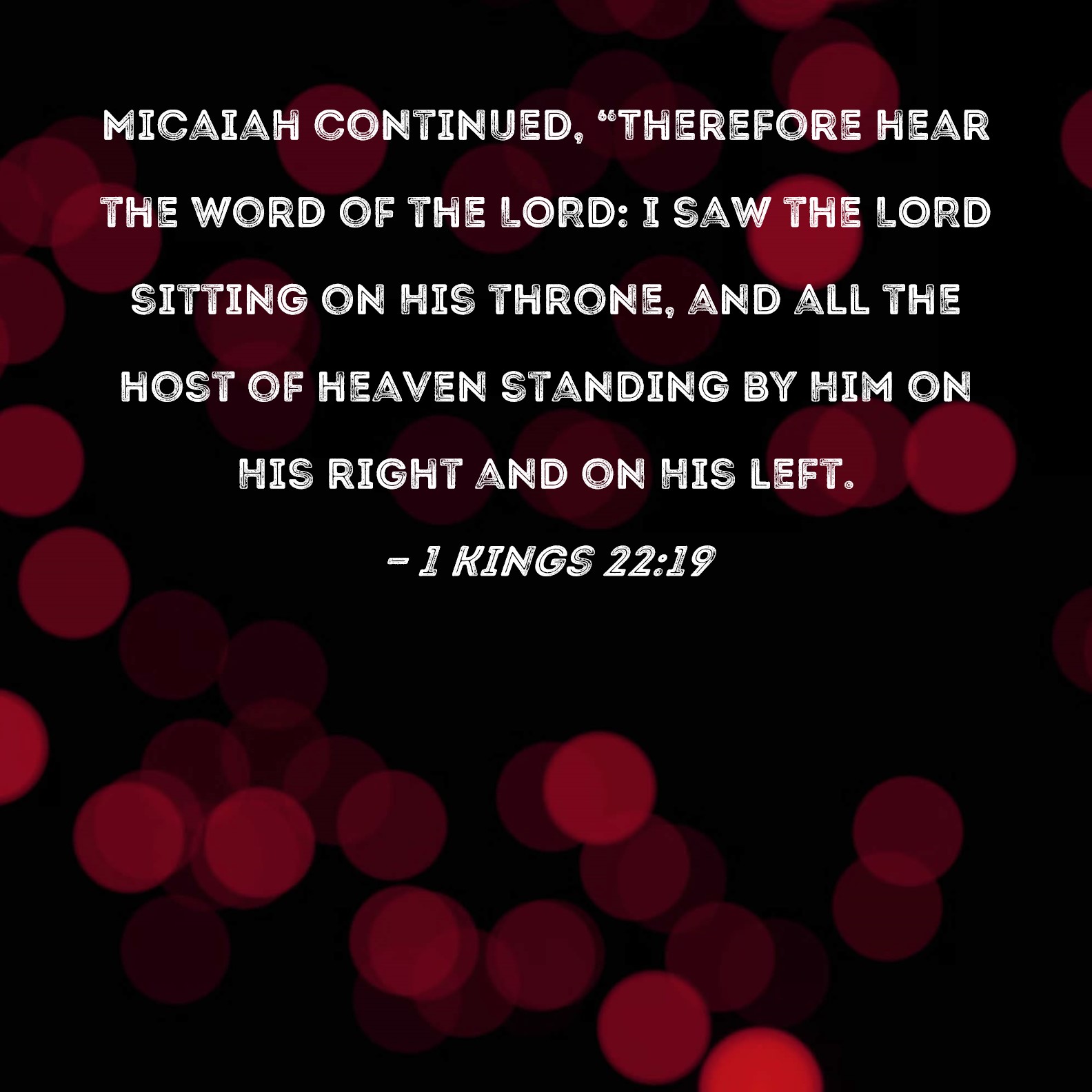 WEB:  Micaiah said, “Therefore hear Yahweh’s word. I saw Yahweh sitting on his throne, and all the army of heaven standing by him on his right hand and on his left.