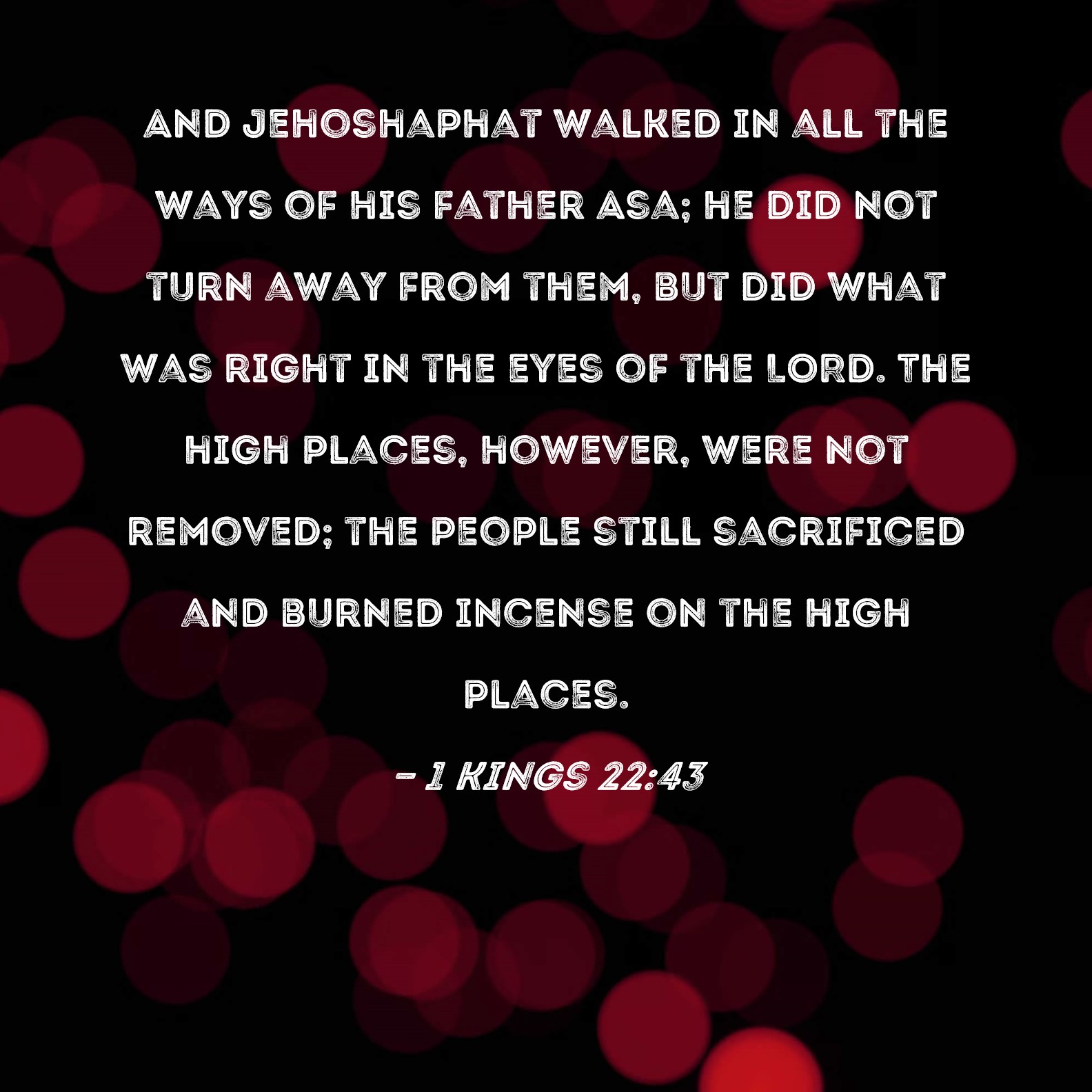 1 Kings 22:43 And Jehoshaphat walked in all the ways of his father Asa; he did not turn away from them, but did what was right in the eyes of the LORD. The high places, however, were not removed; the people still sacrificed and burned incense on the high places.