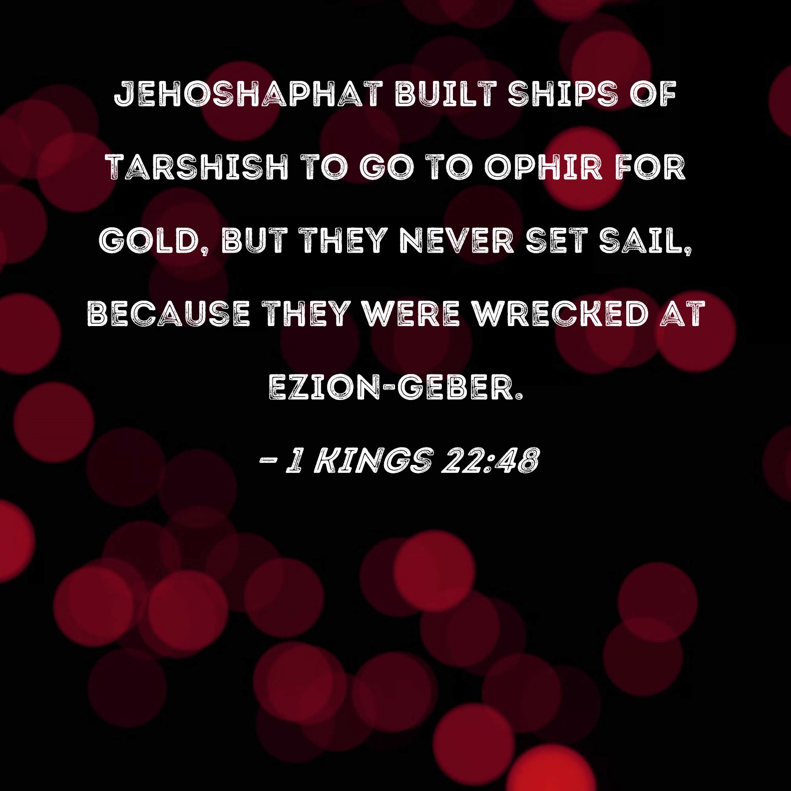 BSB: Jehoshaphat built ships of Tarshish to go to Ophir for gold, but they never set sail, because they were wrecked at Ezion-geber. KJV: Jehoshaphat made ships of Tharshish to go to Ophir for gold: but they went not; for the ships were broken at Eziongeber. DRB: But king Josaphat made navies on the sea, to sail into Ophir for gold: but they could not go, for the ships were broken in Asiongaber. DBT: Jehoshaphat made Tarshish-ships to go to Ophir for gold; but they went not, for the ships were broken at Ezion-geber. ERV: Jehoshaphat made ships of Tarshish to go to Ophir for gold: but they went not; for the ships were broken at Ezion-geber. WBT: Jehoshaphat made ships of Tharshish to go to Ophir for gold: but they went not; for the ships were broken at Ezion-geber. WEB: Jehoshaphat made ships of Tarshish to go to Ophir for gold, but they didn’t go, for the ships wrecked at Ezion Geber. YLT: Jehoshaphat made ships at Tarshish to go to Ophir for gold, and they went not, for the ships were broken in Ezion-Geber.Links 1 Kings 22:48 NIV • 1 Kings 22:48 NLT • 1 Kings 22:48 ESV • 1 Kings 22:48 NASB • 1 Kings 22:48 KJV • 1 Kings 22:48 Interlinear • 1 Kings 22:48 Commentaries • 1 Kings 22:48 Parallel Texts • 1 Kings 22:48 Bible Apps • 1 Kings 22:48 Parallel • Bible Hub |