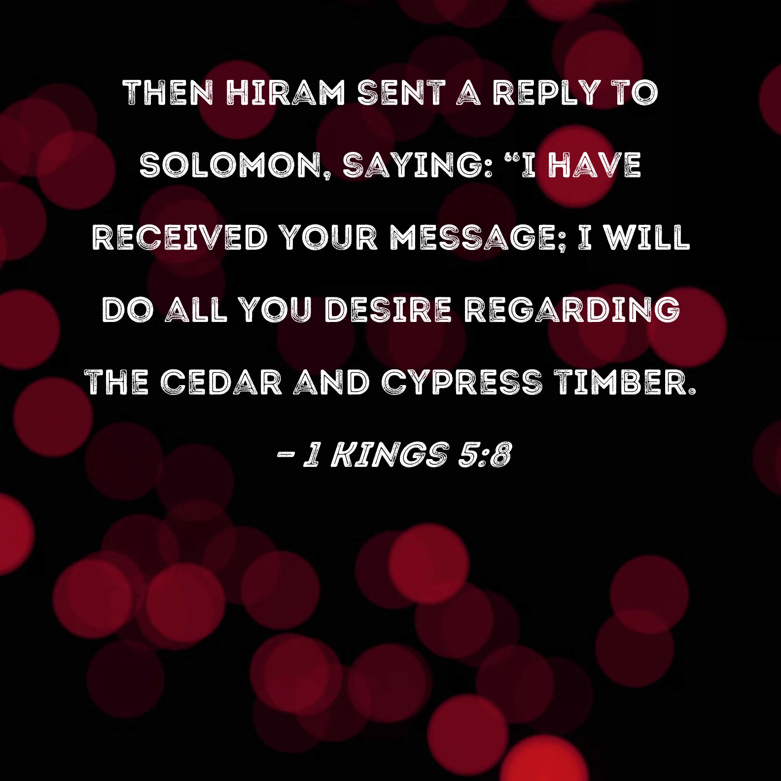 1 Kings 5:8 Then Hiram sent a reply to Solomon, saying: "I have received your message; I will do all you desire regarding the cedar and cypress timber.