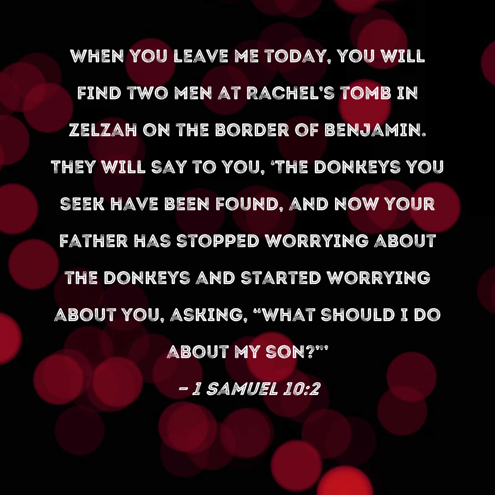 1 Samuel 10:2 When you leave me today, you will find two men at Rachel's tomb in Zelzah on the border of Benjamin. They will say to you, 'The donkeys you seek have been found, and now your father has stopped worrying about the donkeys and started worrying about you, asking, "What should I do about my son?"'