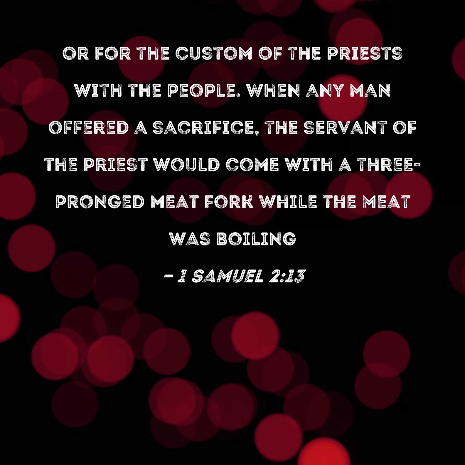 BSB: or for the custom of the priests with the people. When any man offered a sacrifice, the servant of the priest would come with a three-pronged meat fork while the meat was boiling KJV: And the priests' custom with the people was, that, when any man offered sacrifice, the priest's servant came, while the flesh was in seething, with a fleshhook of three teeth in his hand; DRB: Nor the office of the priests to the people: but whosoever had offered a sacrifice, the servant of the priest came, while the flesh was in boiling, with a fleshhook of three teeth in his hand, DBT: And the priests' custom with the people was, when any man sacrificed a sacrifice, the priest's servant came, when the flesh was cooked, with a flesh-hook of three prongs in his hand; ERV: And the custom of the priests with the people was, that, when any man offered sacrifice, the priest's servant came, while the flesh was in seething, with a fleshhook of three teeth in his hand; WBT: And the priest's custom with the people was, that, when any man offered sacrifice, the priest's servant came, while the flesh was in seething, with a flesh-hook of three teeth in his hand; WEB: The custom of the priests with the people was that when anyone offered a sacrifice, the priest’s servant came while the meat was boiling, with a fork of three teeth in his hand; YLT: And the custom of the priests with the people is: any man sacrificing a sacrifice — then hath the servant of the priest come in when the flesh is boiling, and the hook of three teeth in his hand,Links 1 Samuel 2:13 NIV • 1 Samuel 2:13 NLT • 1 Samuel 2:13 ESV • 1 Samuel 2:13 NASB • 1 Samuel 2:13 KJV • 1 Samuel 2:13 Interlinear • 1 Samuel 2:13 Commentaries • 1 Samuel 2:13 Parallel Texts • 1 Samuel 2:13 Bible Apps • 1 Samuel 2:13 Parallel • Bible Hub |
