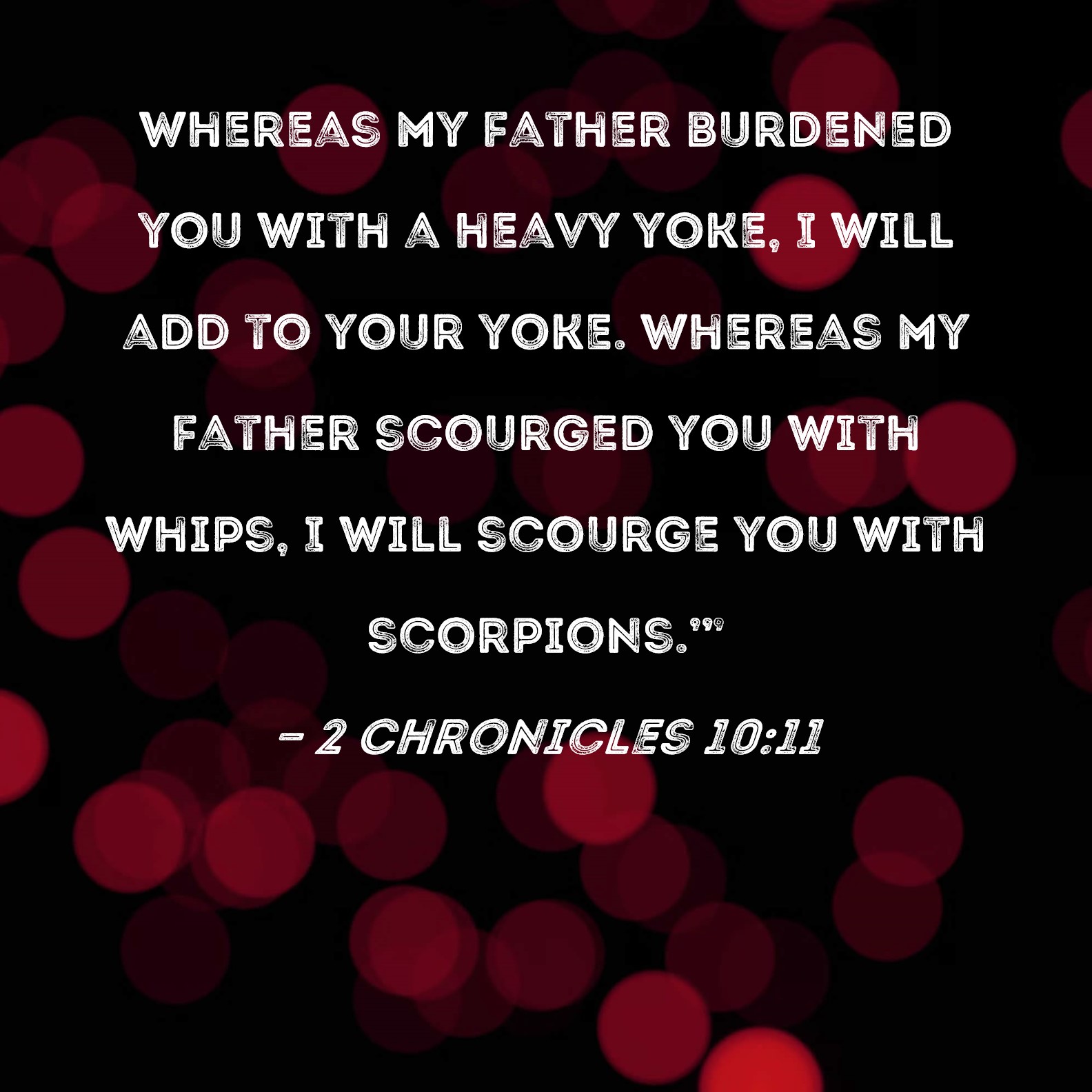 2 Chronicles 10:11 Whereas my father burdened you with a heavy yoke, I will add to your yoke. Whereas my father scourged you with whips, I will scourge you with scorpions.'"