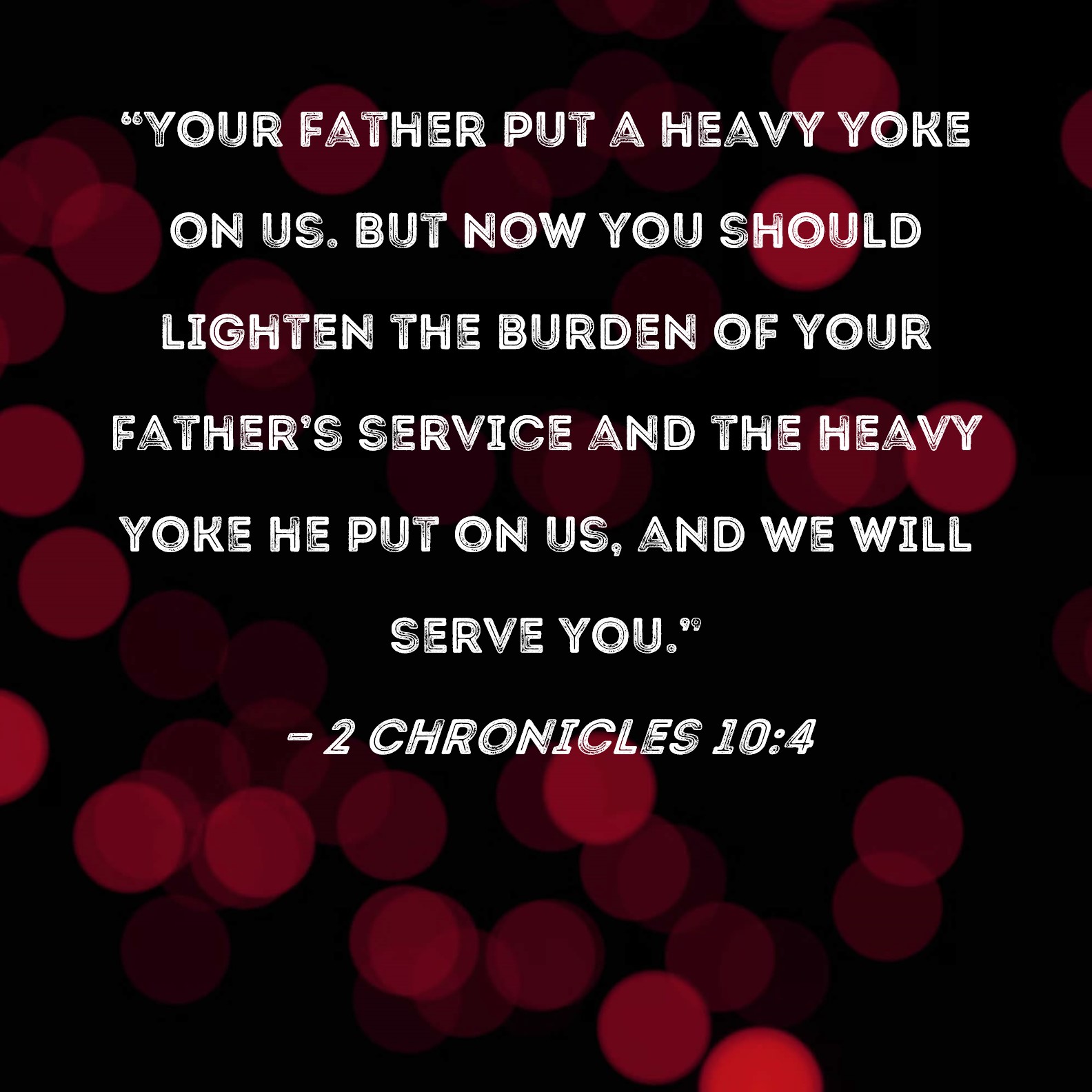 2 Chronicles 10:4 "Your father put a heavy yoke on us. But now you should lighten the burden of your father's service and the heavy yoke he put on us, and we will serve you."