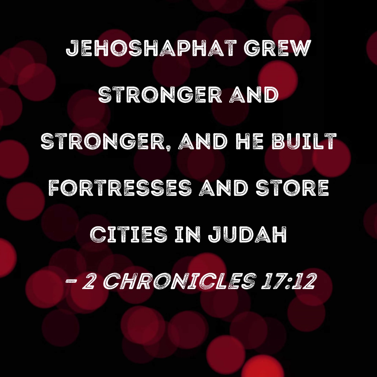 2 Chronicles 17:12 Jehoshaphat grew stronger and stronger, and he built fortresses and store cities in Judah