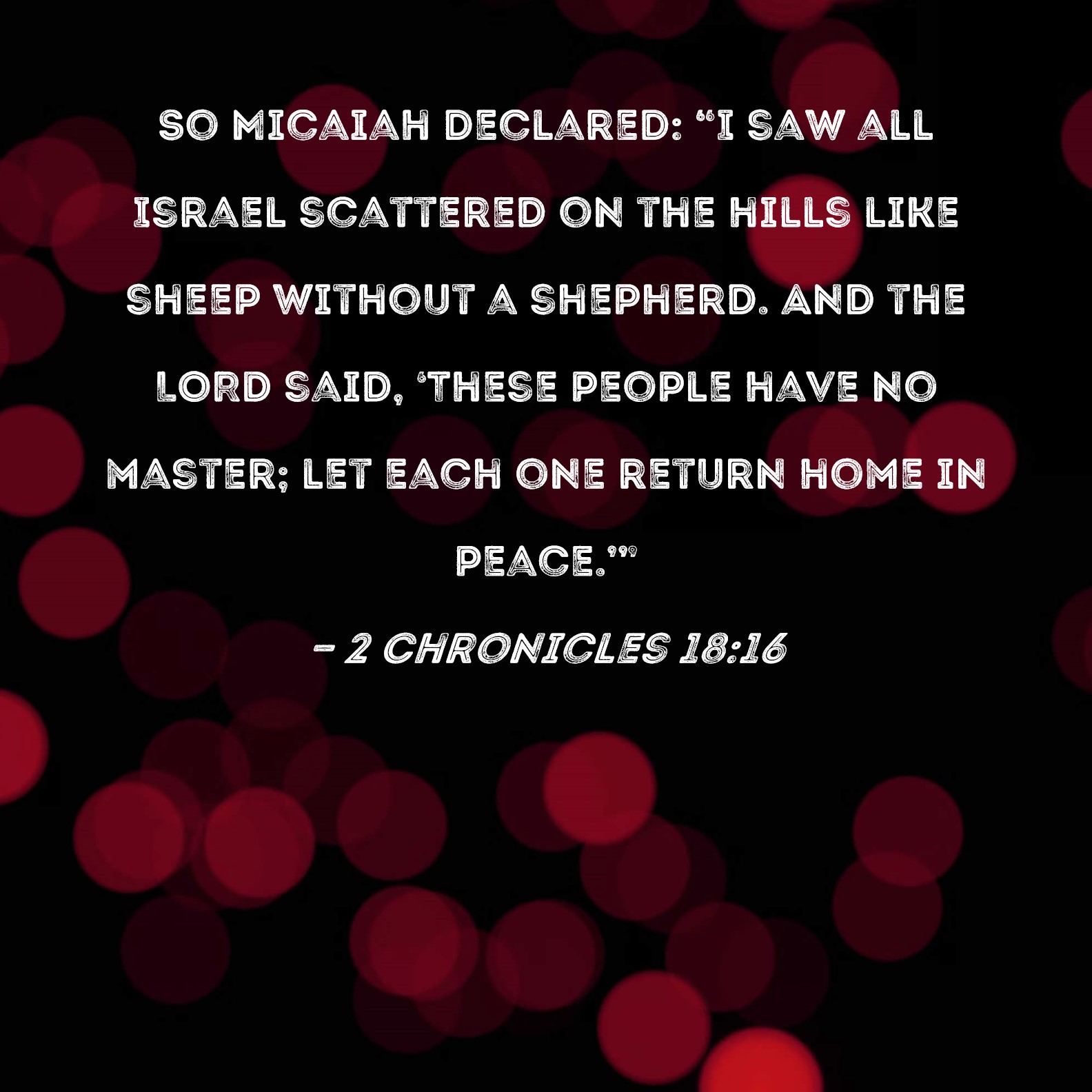 2 Chronicles 18:16 So Micaiah declared: "I saw all Israel scattered on the hills like sheep without a shepherd. And the LORD said, 'These people have no master; let each one return home in peace.'"
