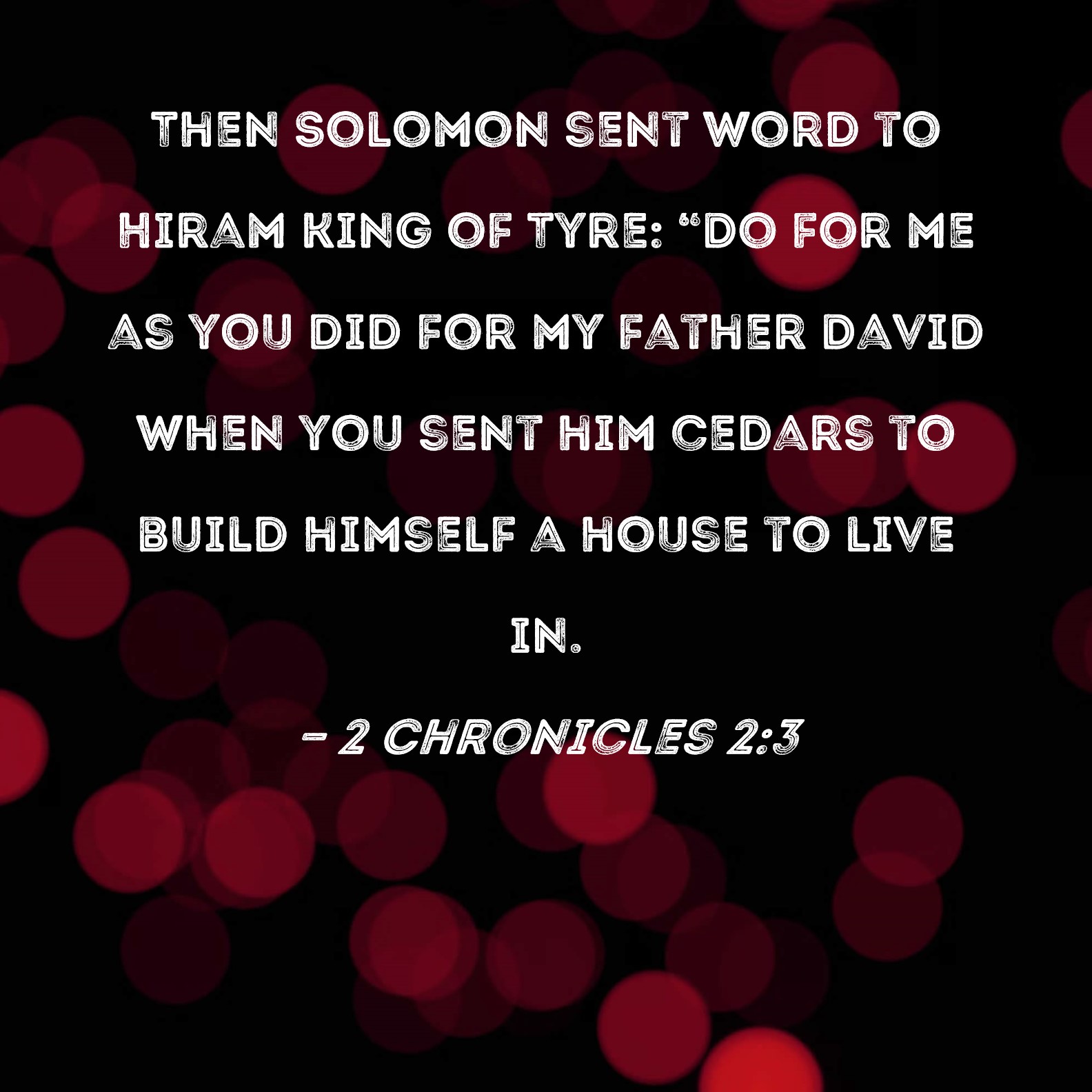 2 Chronicles 2:3 Then Solomon sent word to Hiram king of Tyre: "Do for me as you did for my father David when you sent him cedars to build himself a house to live in.